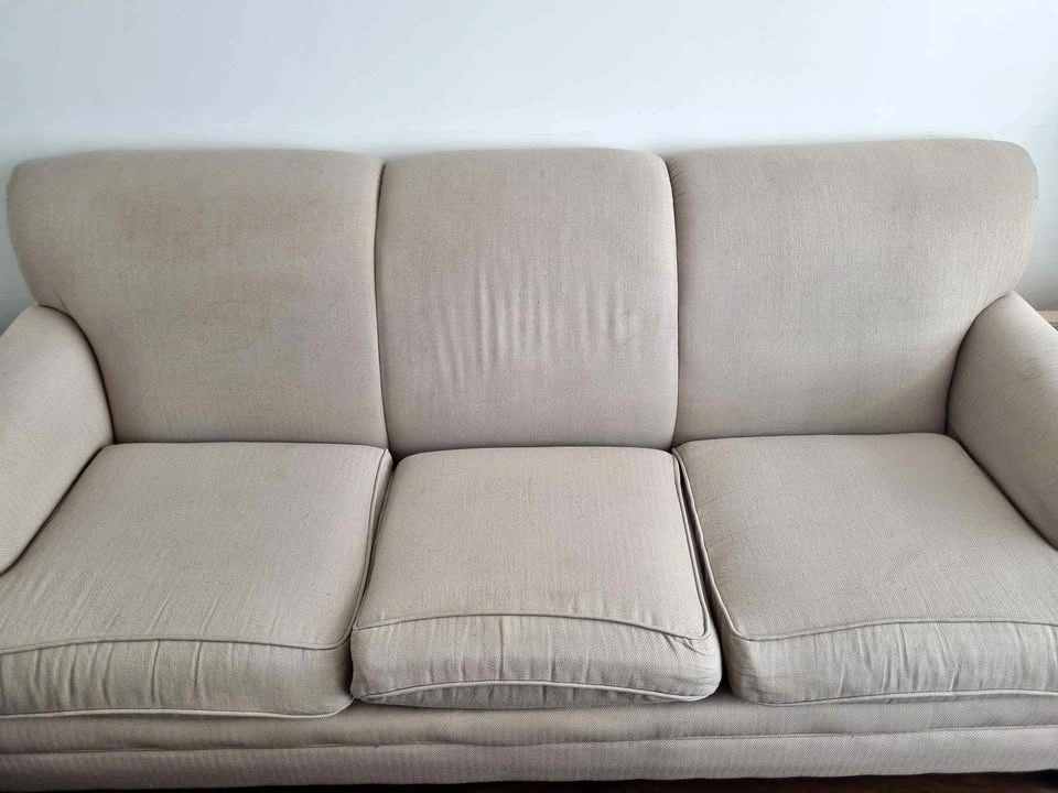 Selling a very high-quality and comfortable sofa set. The foam and cushions are in excellent condition—firm and haven't lost their shape at all. The frames are very solid and sturdy. Structurally 10/10. The fabric needs a good steam clean/shampooing to look fresh again. Because of this, I’m listing it for free !