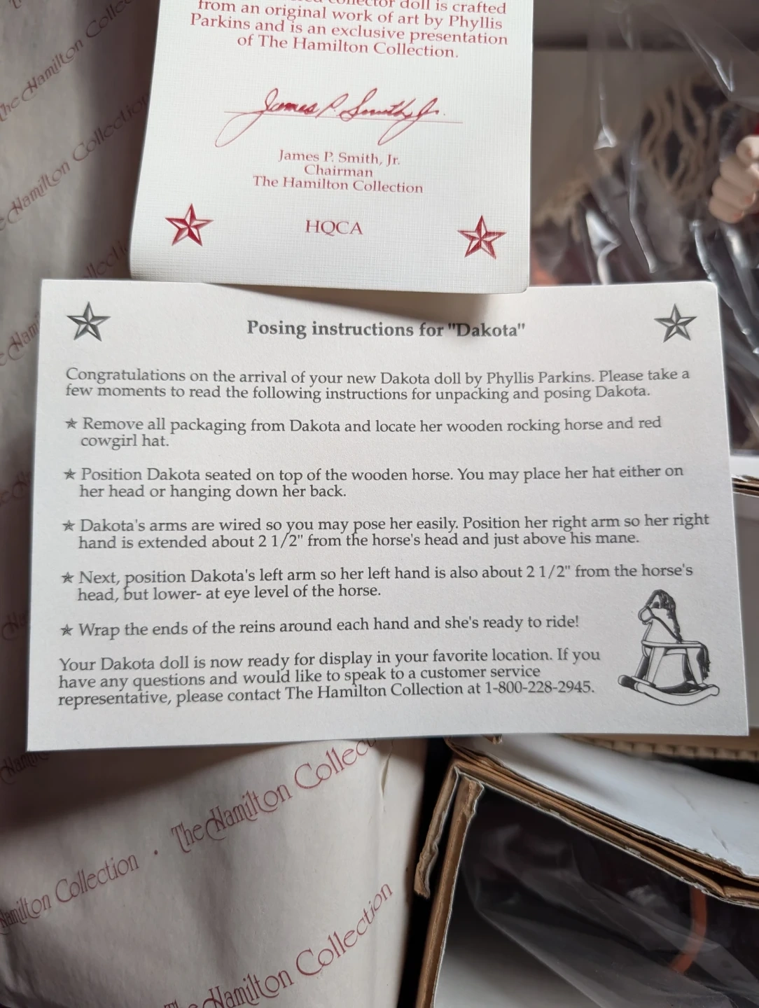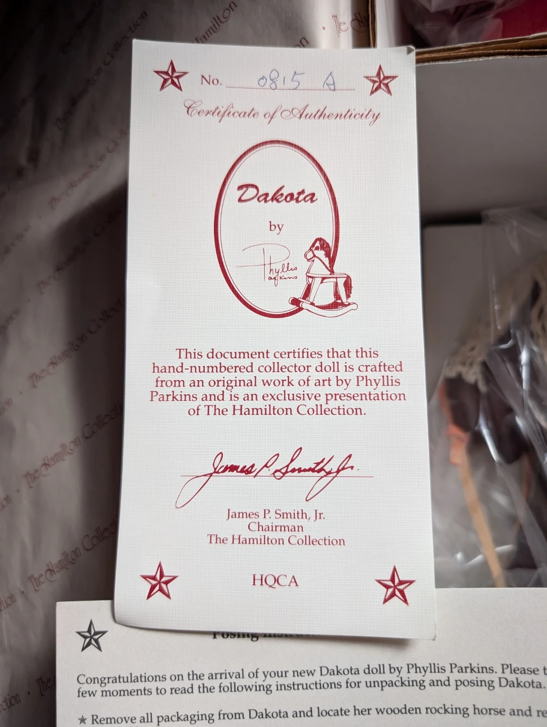 This is the Dakota doll by Phyllis Parkins from The Hamilton Collection. It's a hand-numbered collector doll. Includes a Certificate of Authenticity and posing instructions.