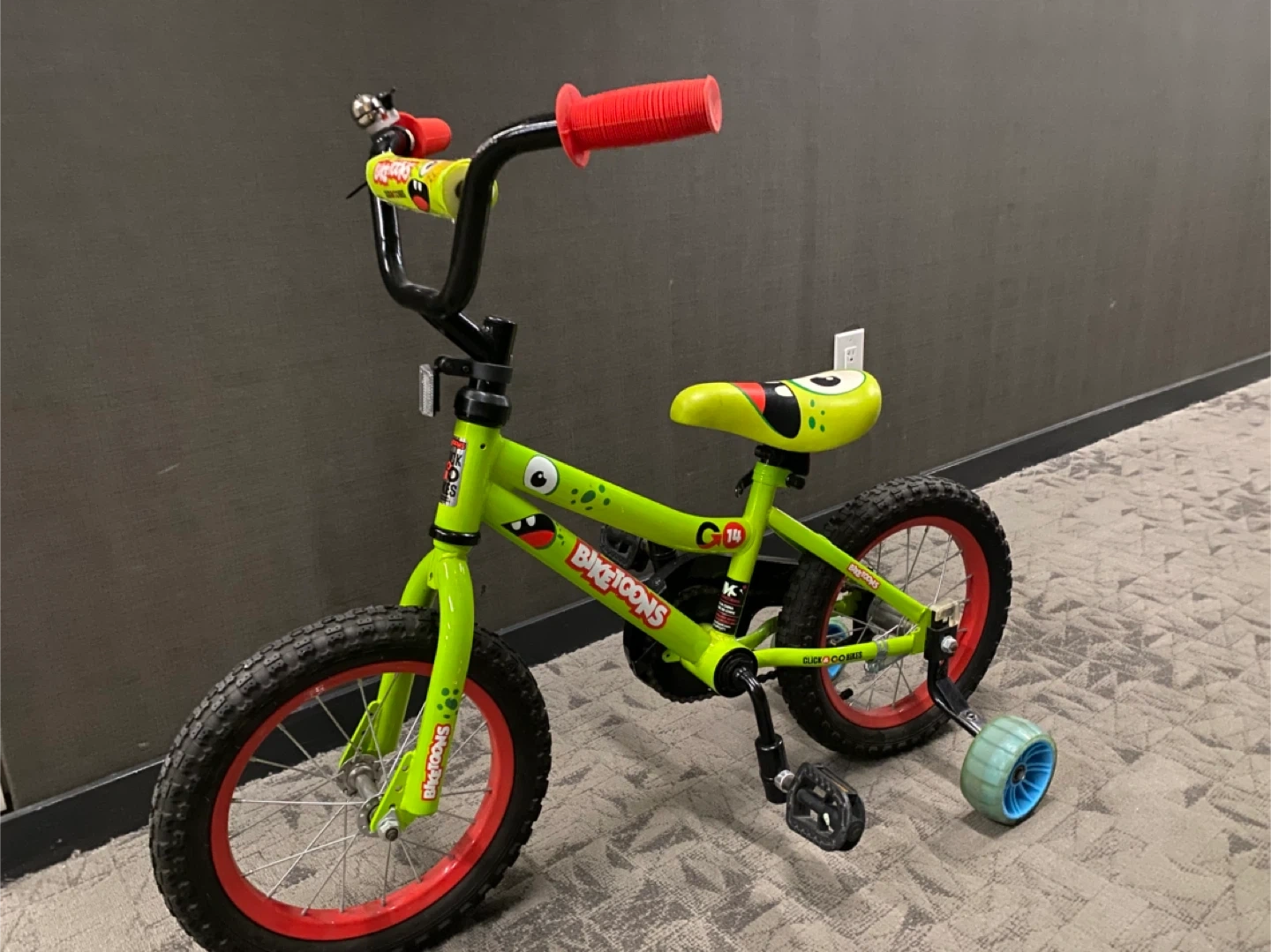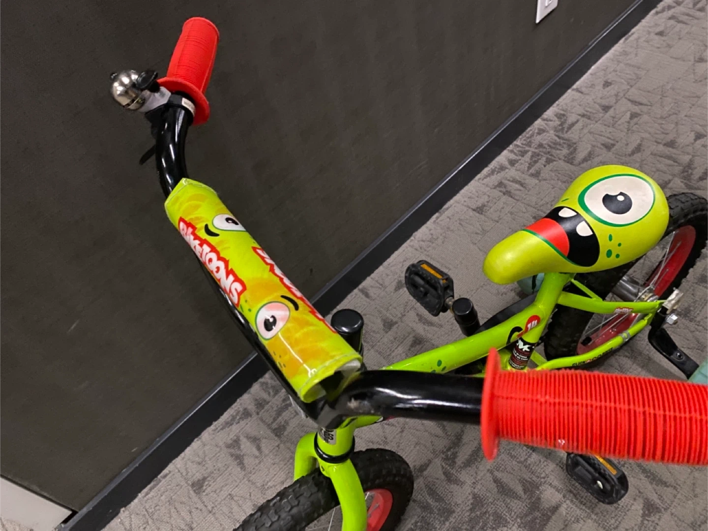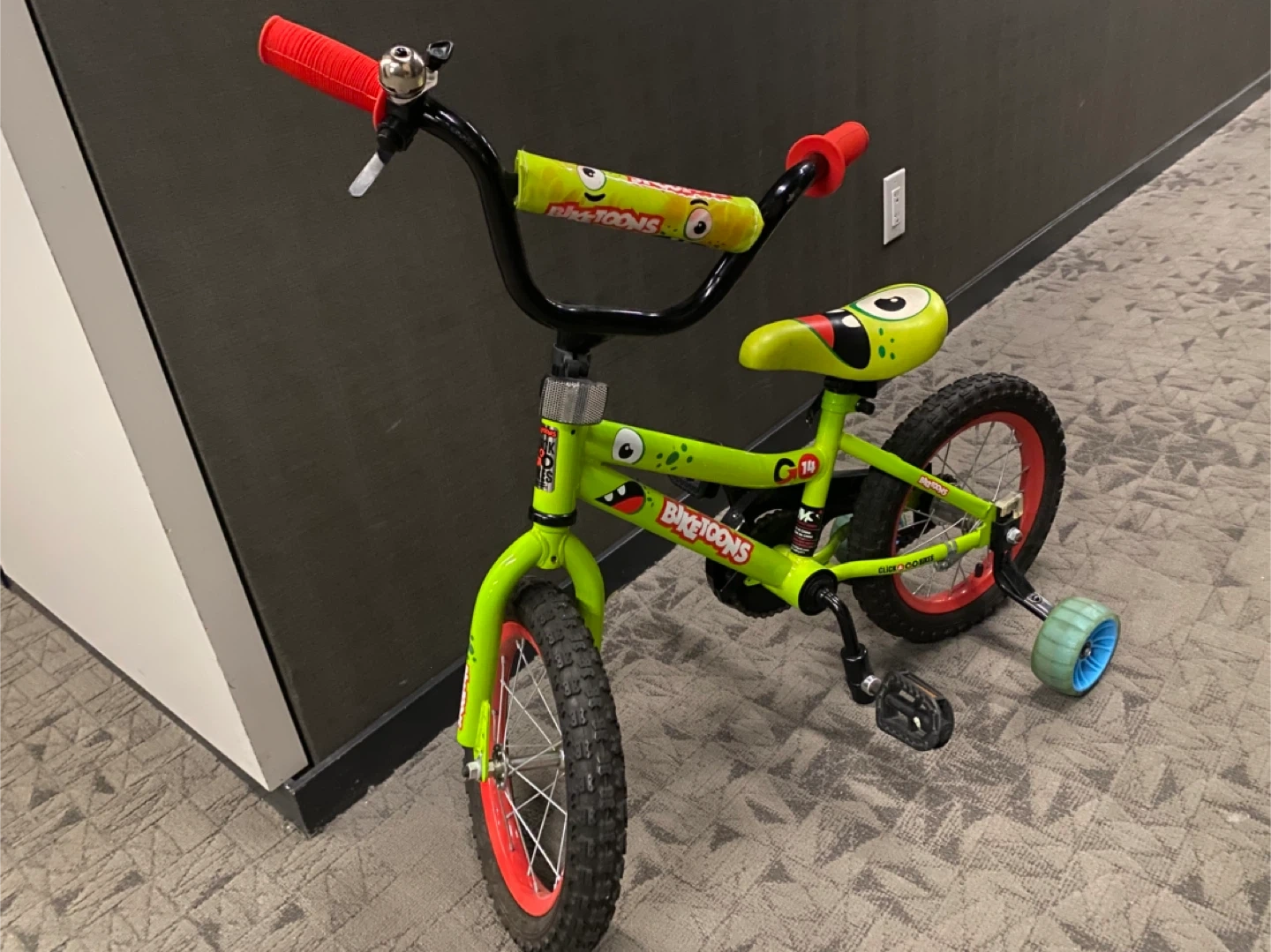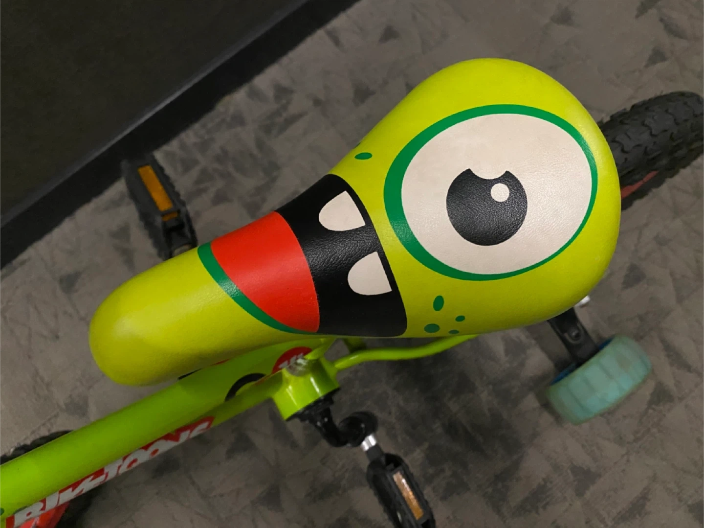 Selling a fun Bike Toons kids bike in bright green! It has a cool monster design on the seat and handlebar pad. Perfect for a young child learning to ride.