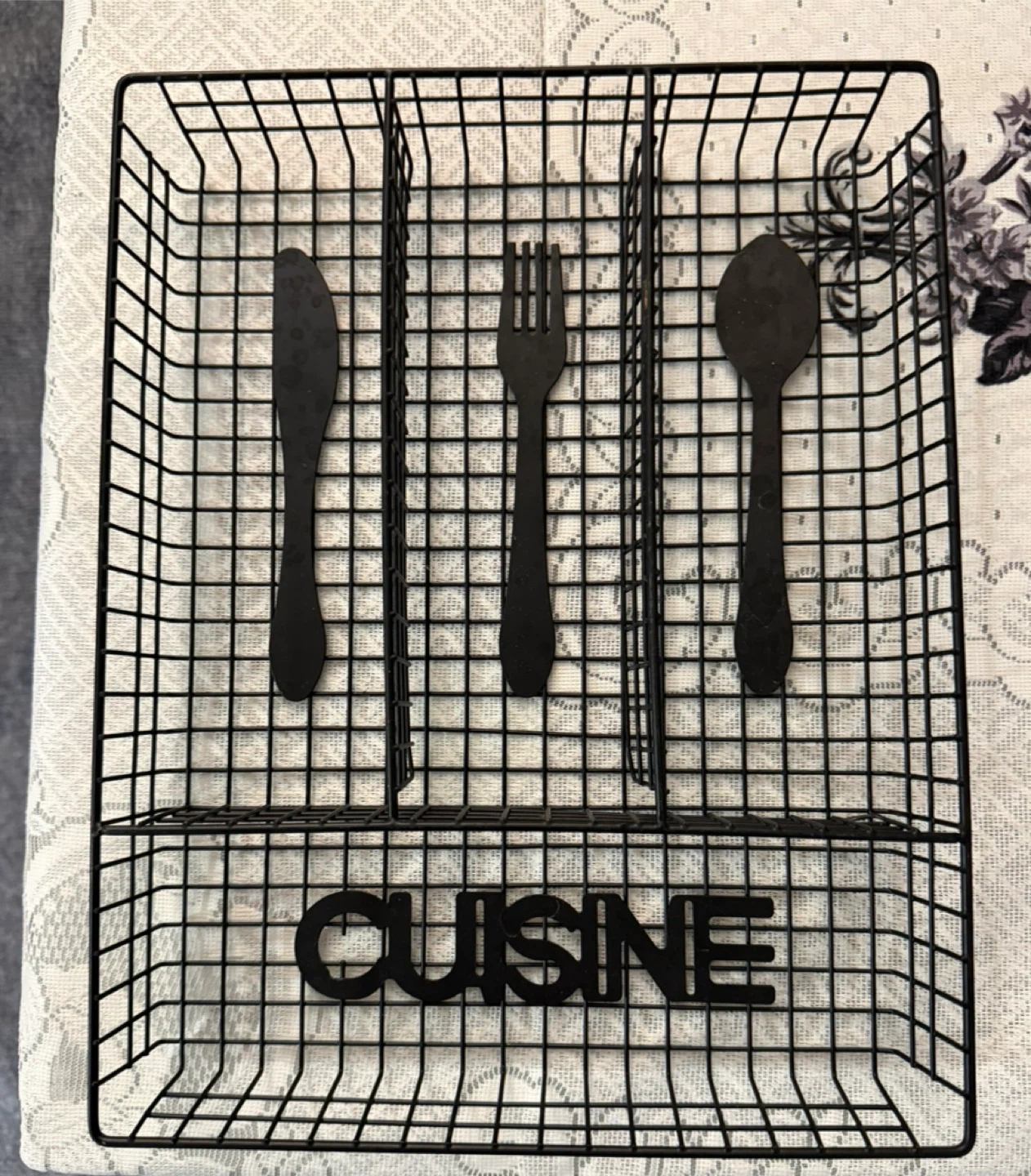 This black wire metal cutlery organizer caddy has three compartments for forks, knives, and spoons. It's designed to keep your kitchen drawers tidy.
