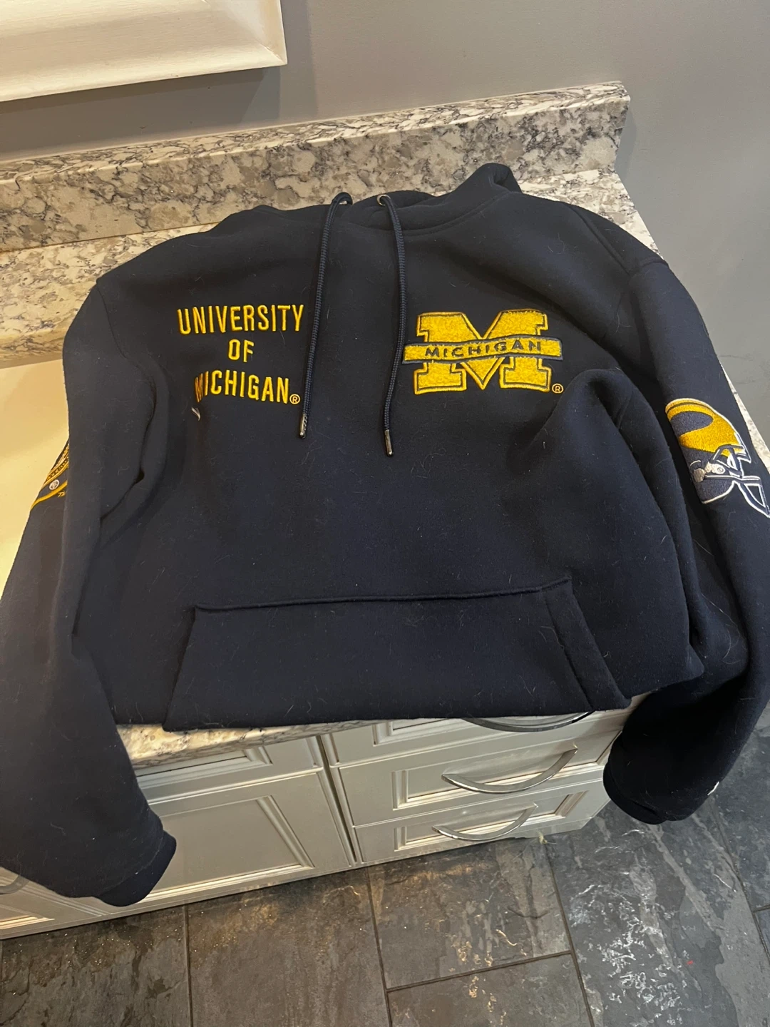 Selling a University of Michigan hoodie. It is navy blue with gold lettering and the Michigan logo on the front. It also has a football helmet design on the sleeve. Perfect for any Michigan fan!