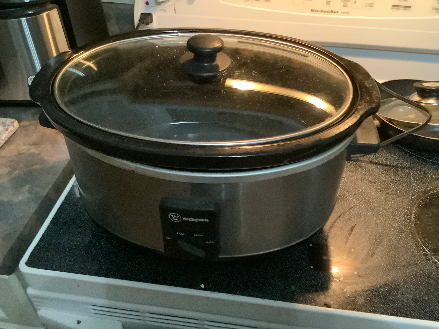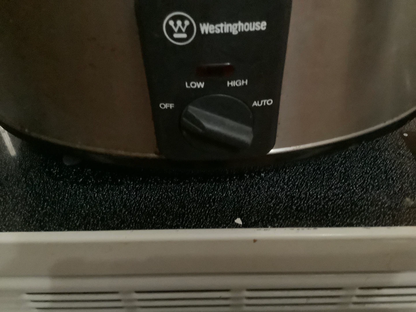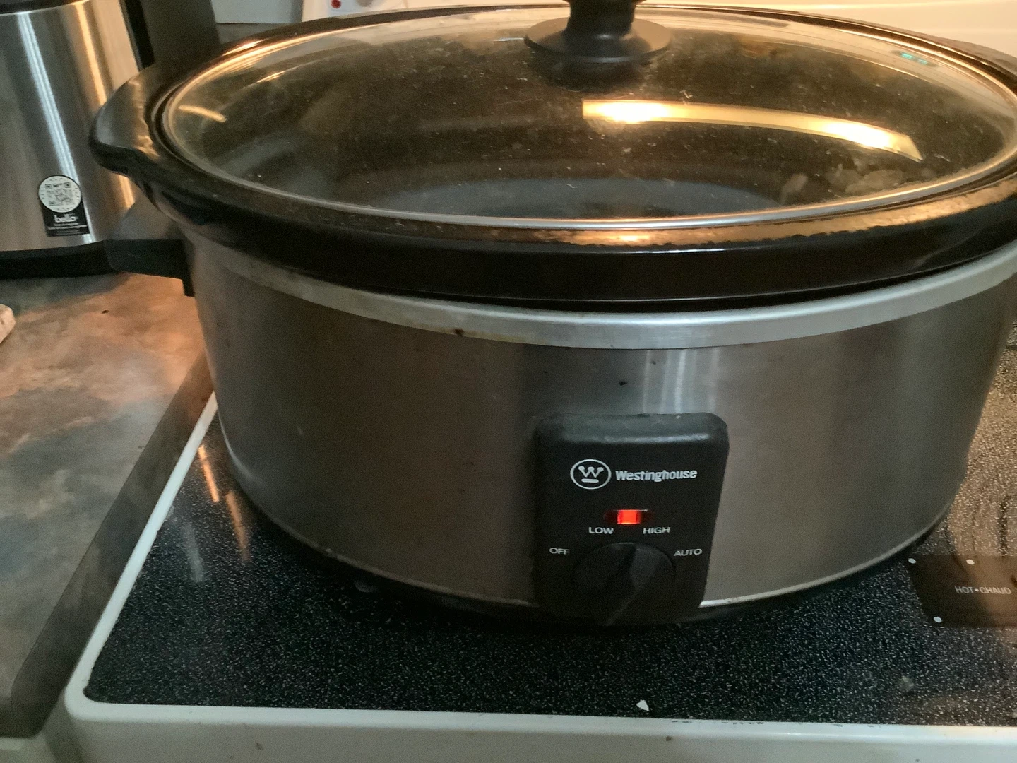 This is a Westinghouse slow cooker with settings for low, high, and auto. It has a glass lid and stainless steel exterior. Perfect for meal prepping.