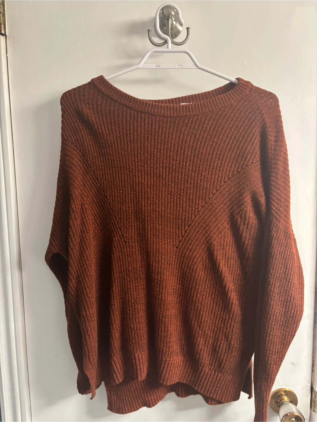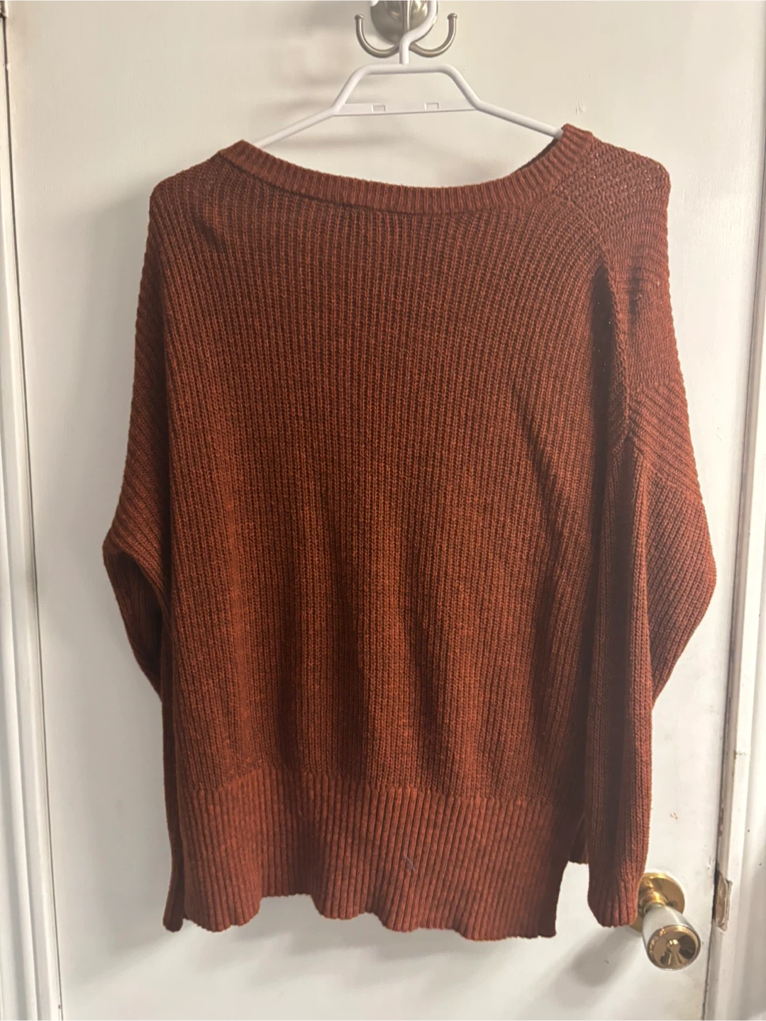 Cozy, rust-coloured knit sweater. It's a relaxed fit with a boat neck. Nice for cooler weather. From Garage $8