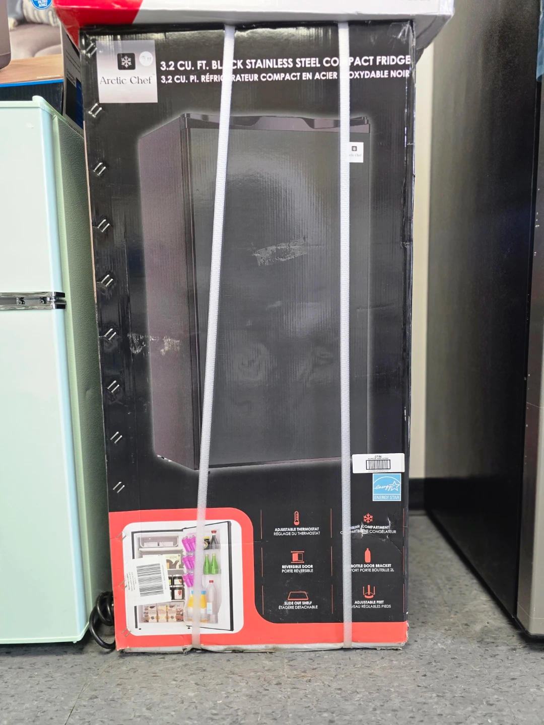 This Arctic Chef compact fridge is 3.2 cu. ft. and finished in black stainless steel. It features an adjustable thermostat and a reversible door. It also includes a slide-out shelf, bottle door bracket, and adjustable feet.
