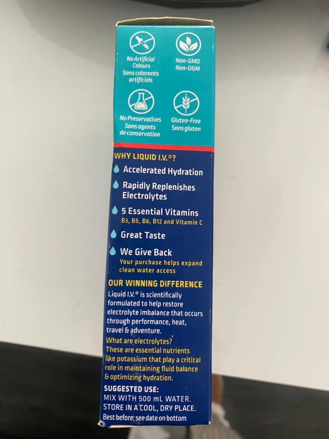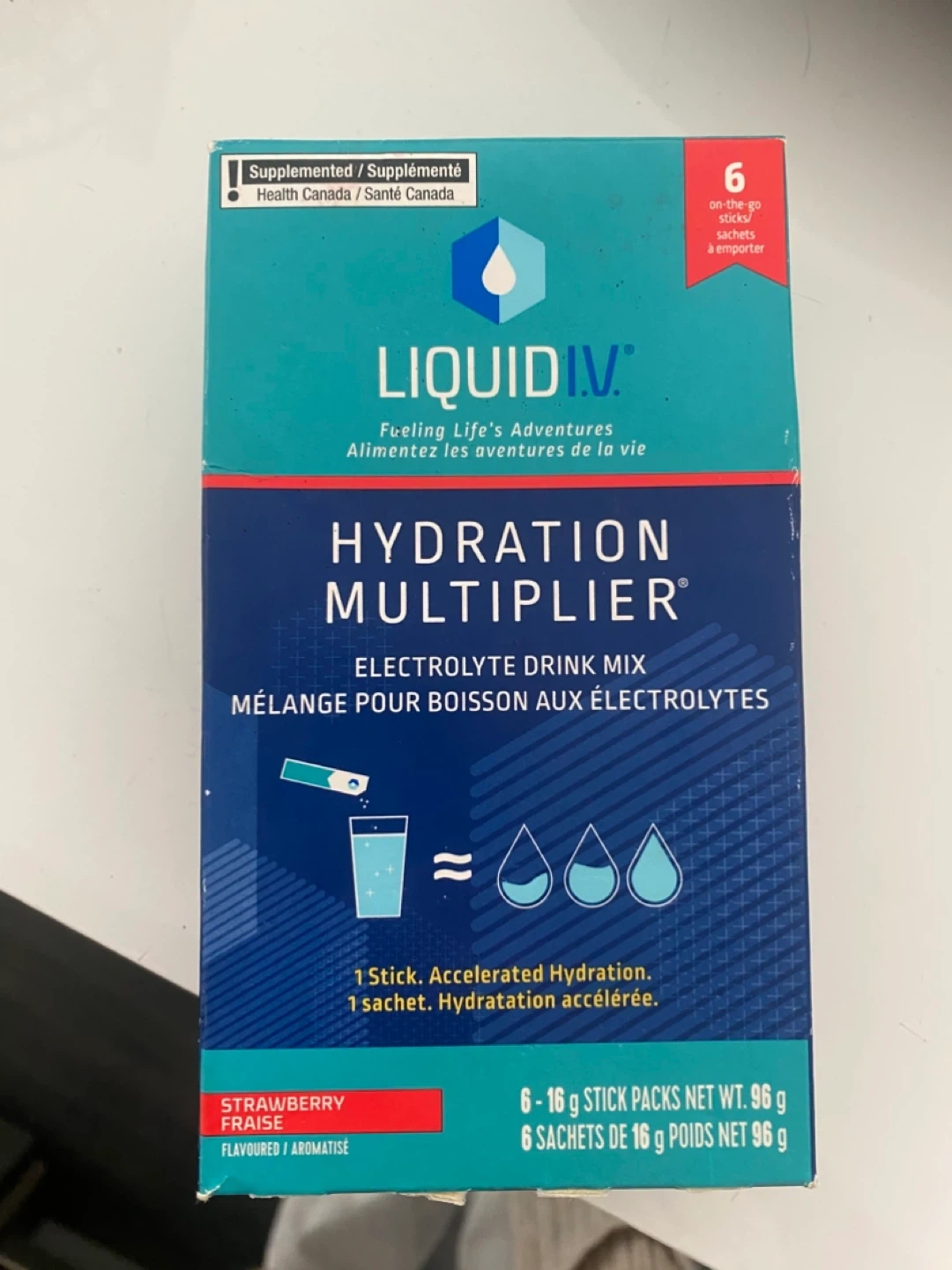 This is a box of strawberry flavoured Liquid IV Hydration Multiplier drink mix containing 4 unopened, single serve 16g packages. The product is gluten-free and non-GMO. Best before date is 2026 April 10.