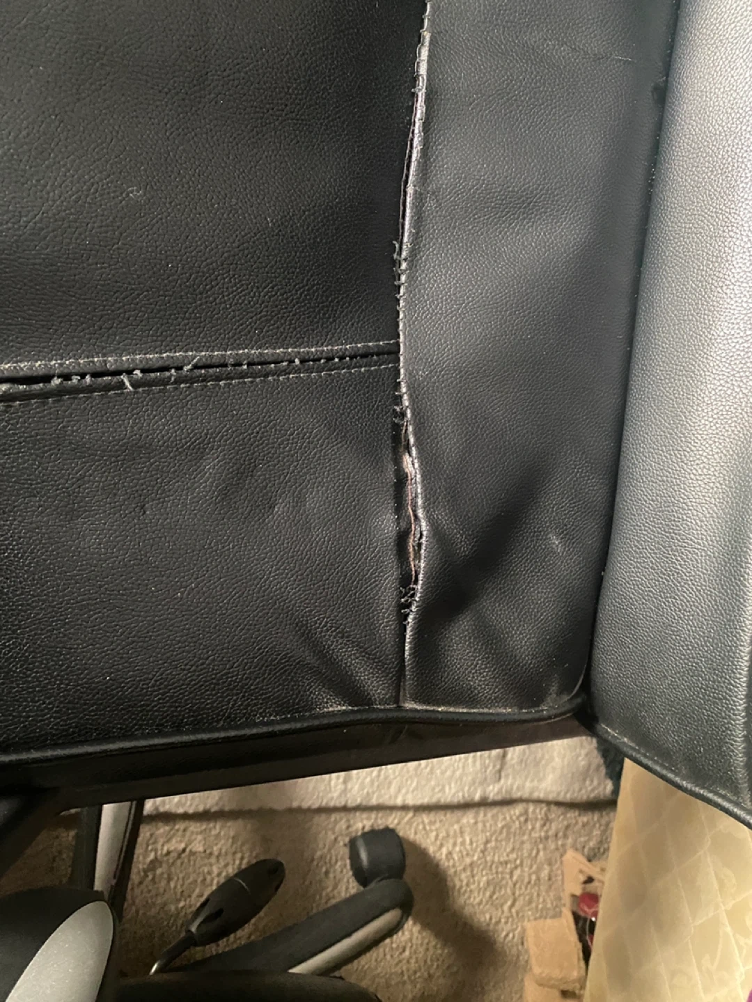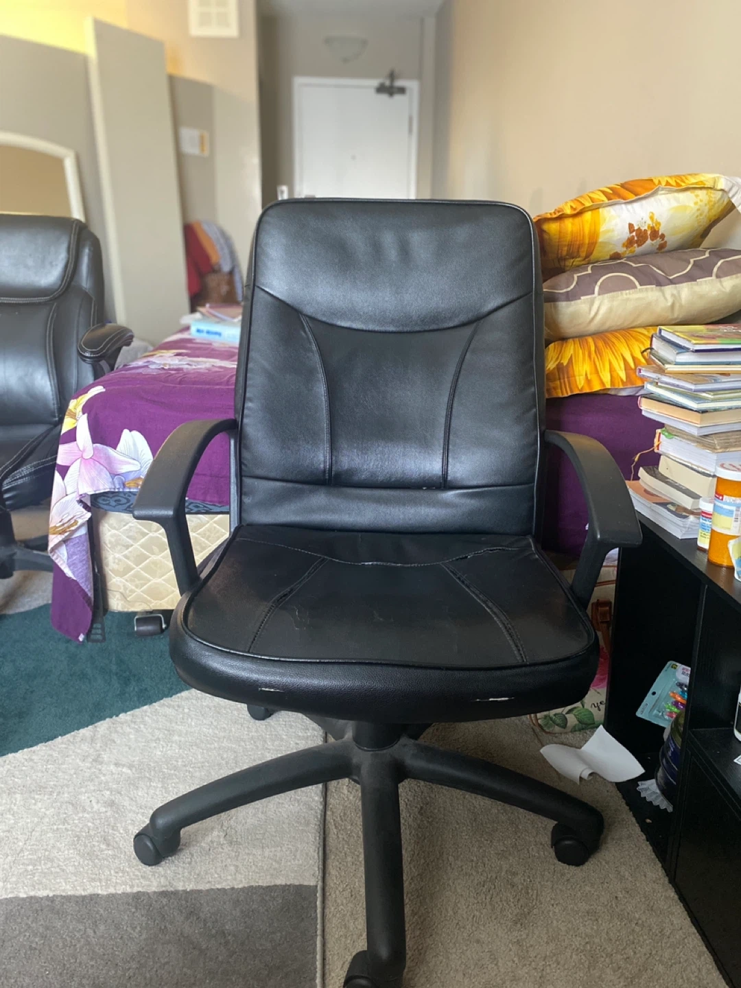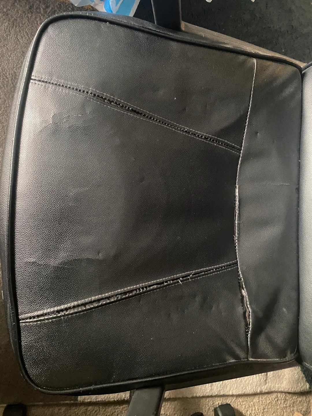 This is a black office chair with a faux leather finish. It has wheels for easy mobility and adjustable height. There's some wear and tear on the seat cushion's stitching. It's suitable for home or office use.