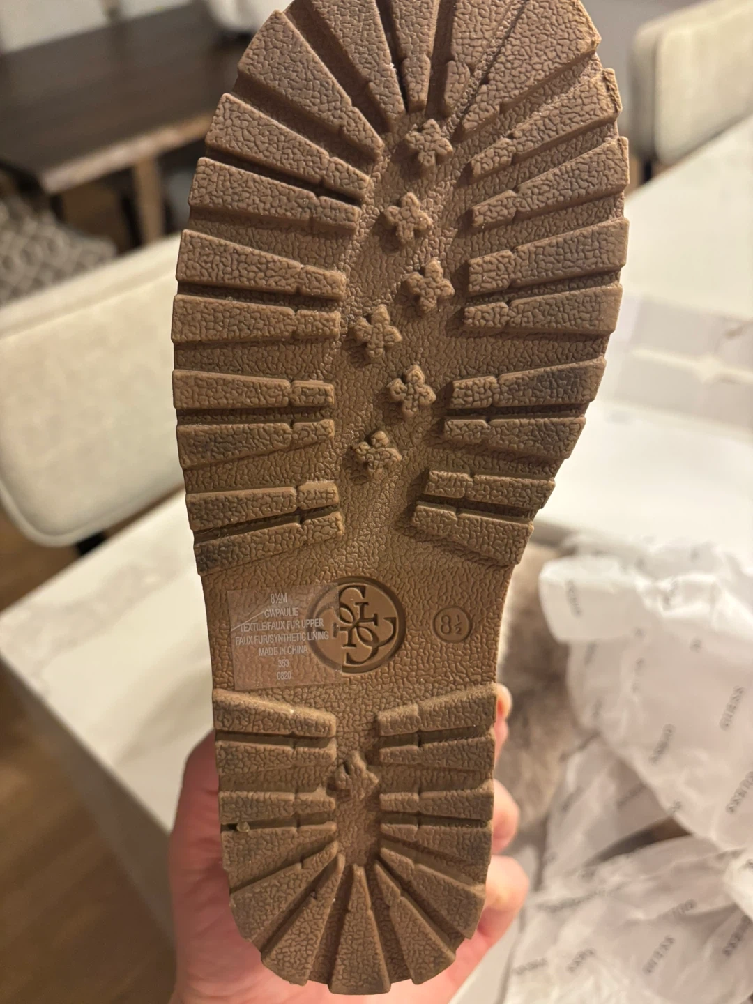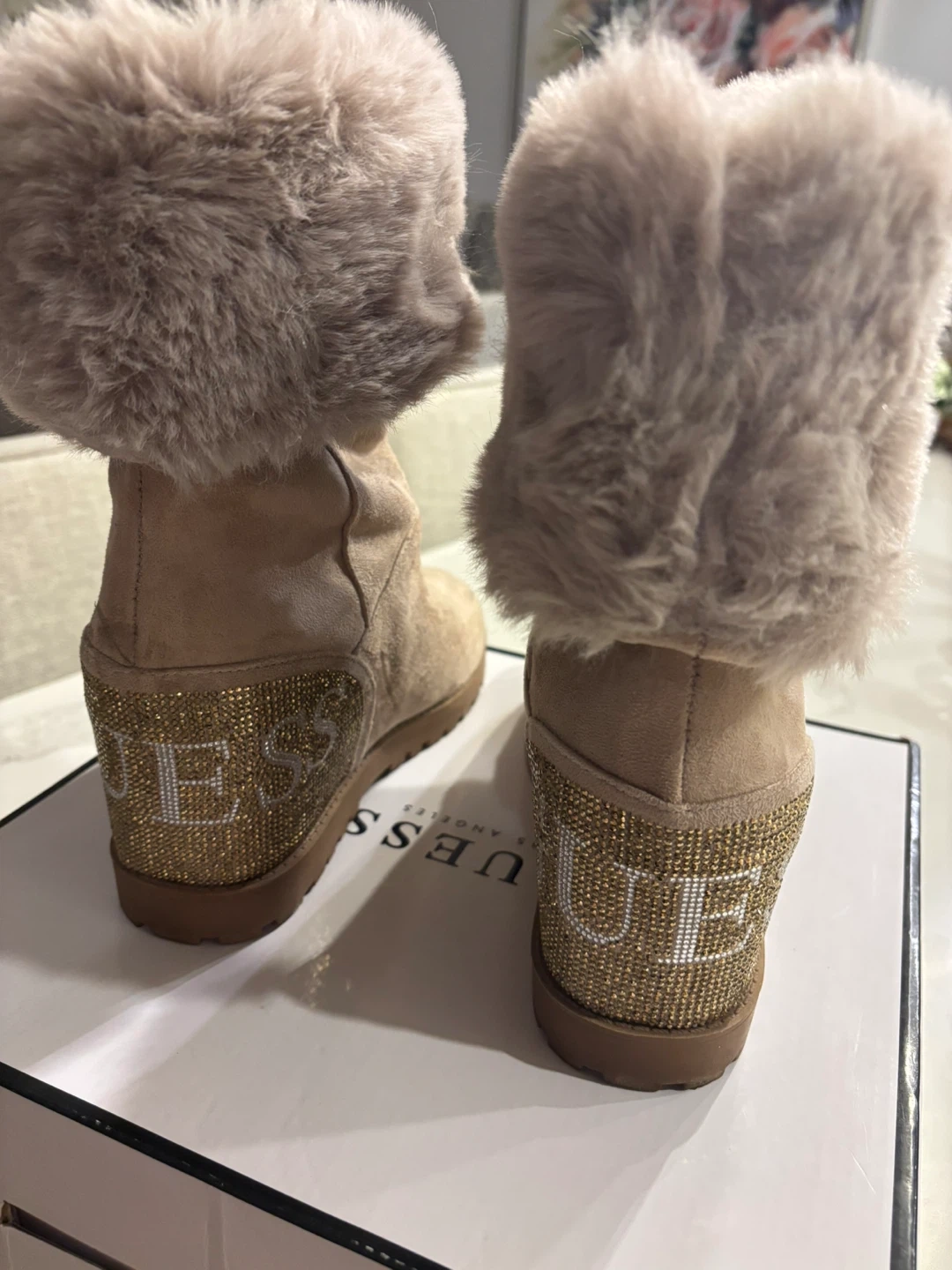 These Guess boots are perfect for adding a touch of glam to your winter wardrobe! They feature a soft beige suede exterior, a cozy faux fur trim, and a sparkly 'GUESS' logo on the back. They're in great condition and ready for cold weather. Worn once almost new