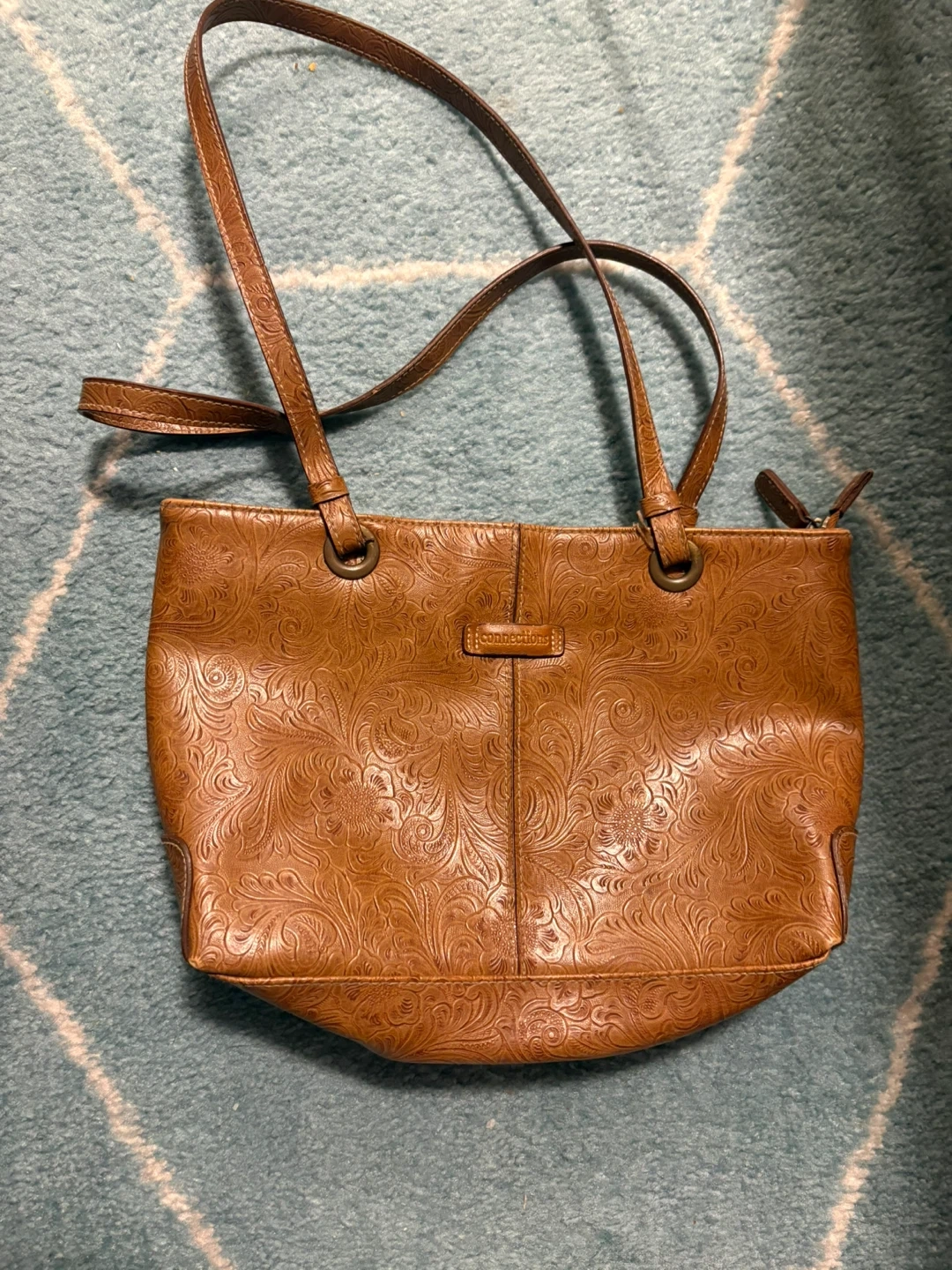 Brown embossed leather shoulder bag. It has a floral pattern all over. The bag has two straps and a zippered closure.