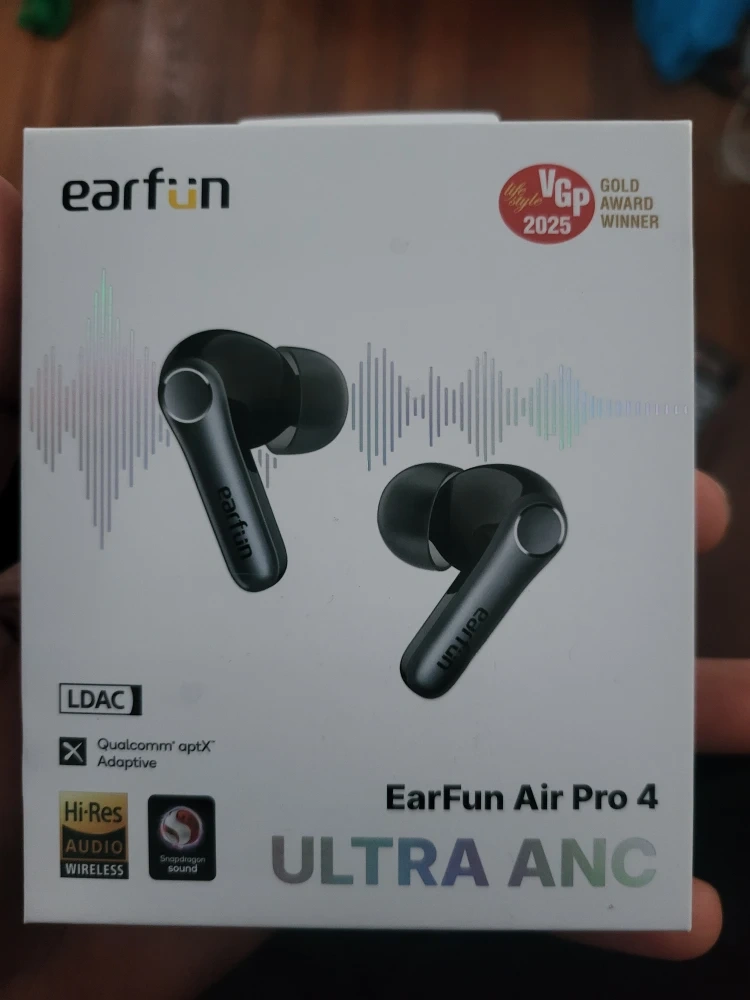 Awesome EarFun Air Pro 4 Ultra ANC earbuds. has LDAC and Qualcomm aptX Adaptive audio. Hi-Res Audio Wireless and Snapdragon Sound too. comes with original box. earbuds and charging case are black and look super clean.