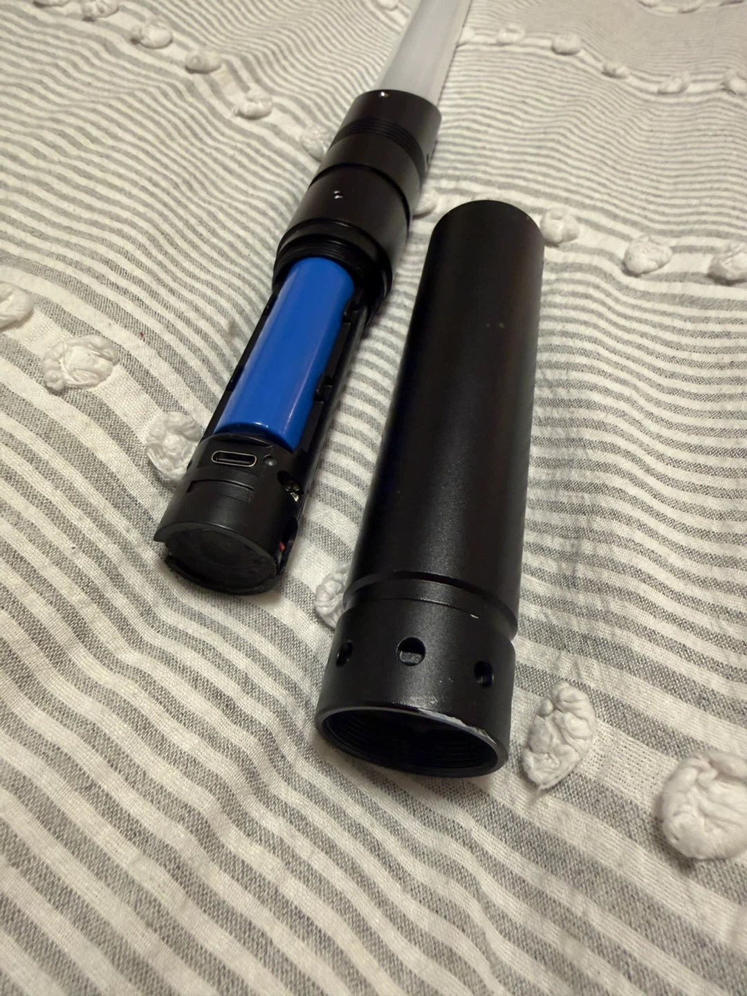 This is a black lightsaber with a rechargeable battery included. It has a USB-C charging port. The blade is translucent white.
