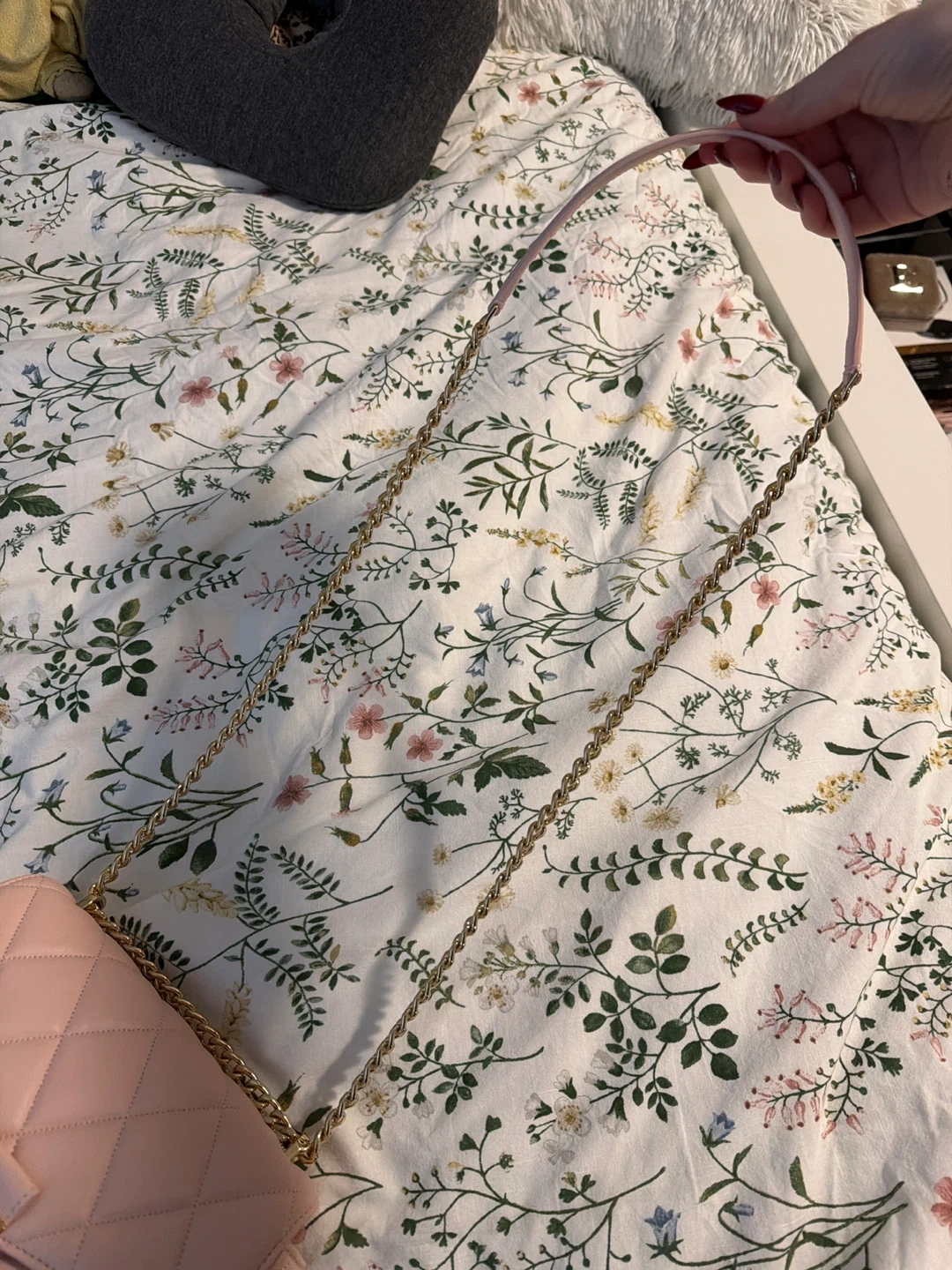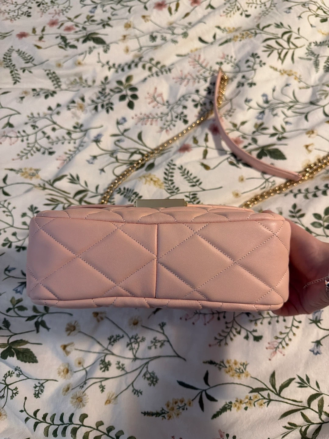 This is a light pink quilted shoulder bag from Kate Spade. It features a gold turn-lock closure and a chain strap. It's a stylish accessory for any occasion!