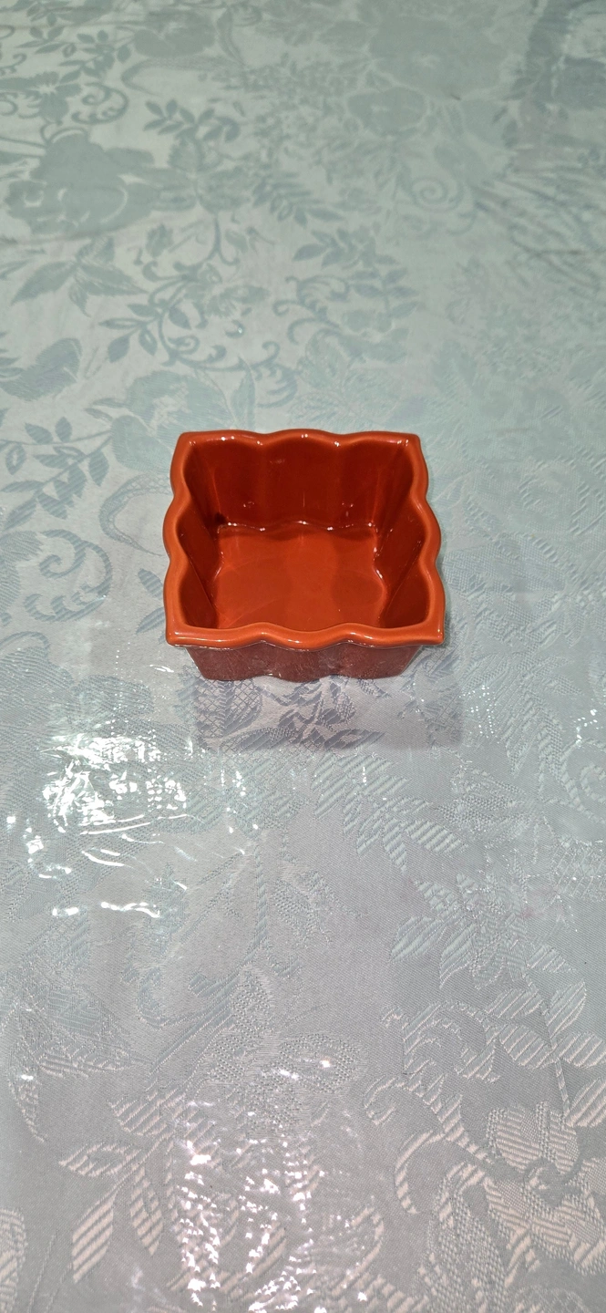 The set includes three square, wave-edged ceramic baking dishes in green, orange, and red colors.