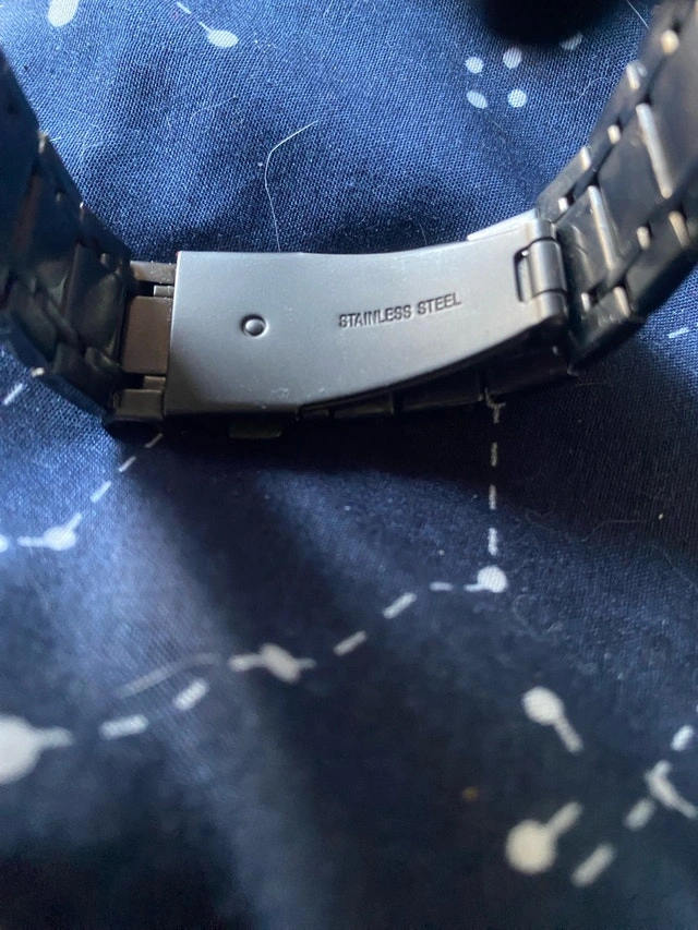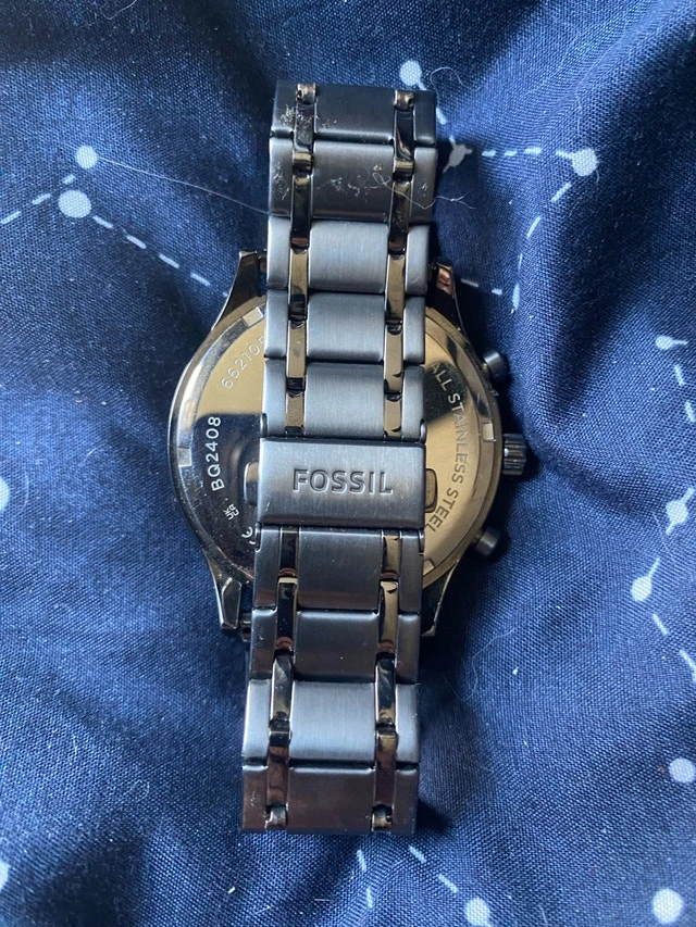 Sleek and stylish Fossil stainless steel watch in great condition. Lightly worn with minimal signs of use. Stainless steel case and band. Face is clean with no scratches. Currently not running – just needs a new battery. Classic black dial with silver-tone markers and red accent second hand, plus subdials. Perfect everyday watch or a great addition to any collection. Simple battery replacement and it’s ready to go! Feel free to message with any questions.