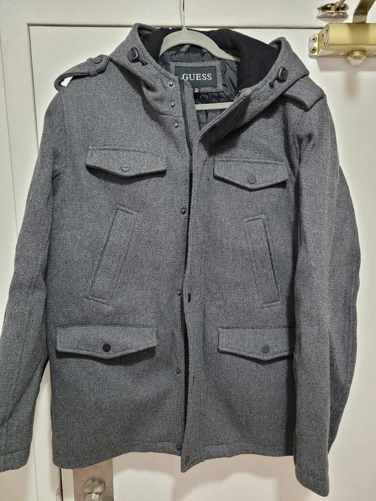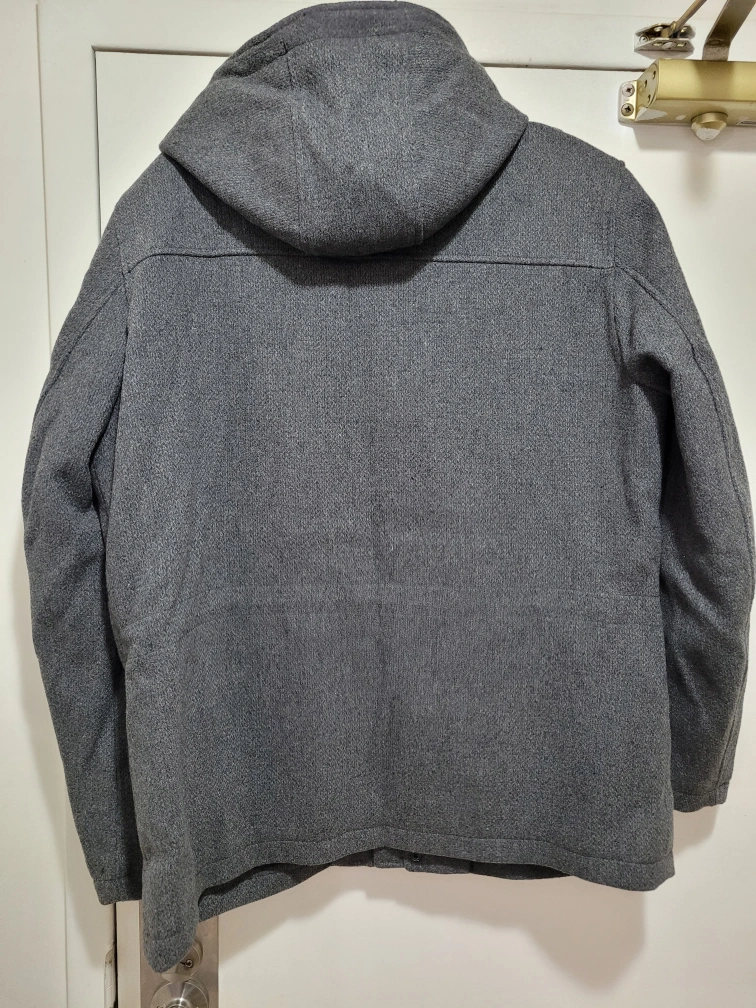 Grey men's peacoat. Features a hood and multiple pockets. Good for colder weather. Insulated.