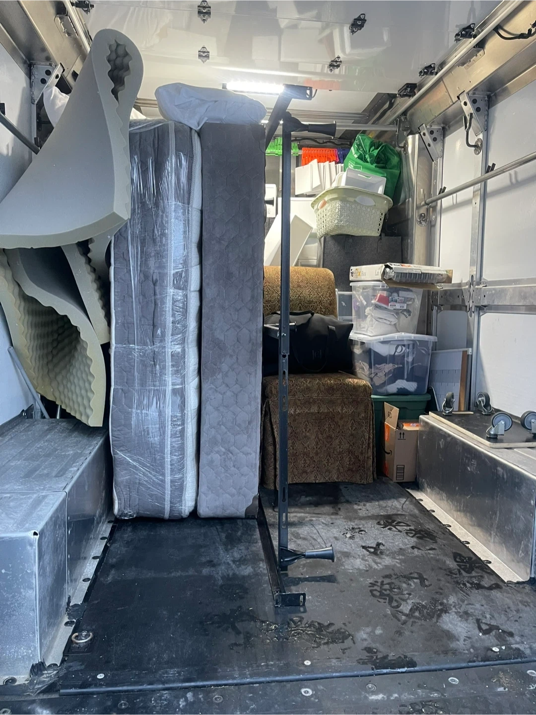 This is a delivery van packed with various items, including furniture, household goods, and personal belongings. It's ready for transport or storage! The van appears to be a commercial model designed for cargo.