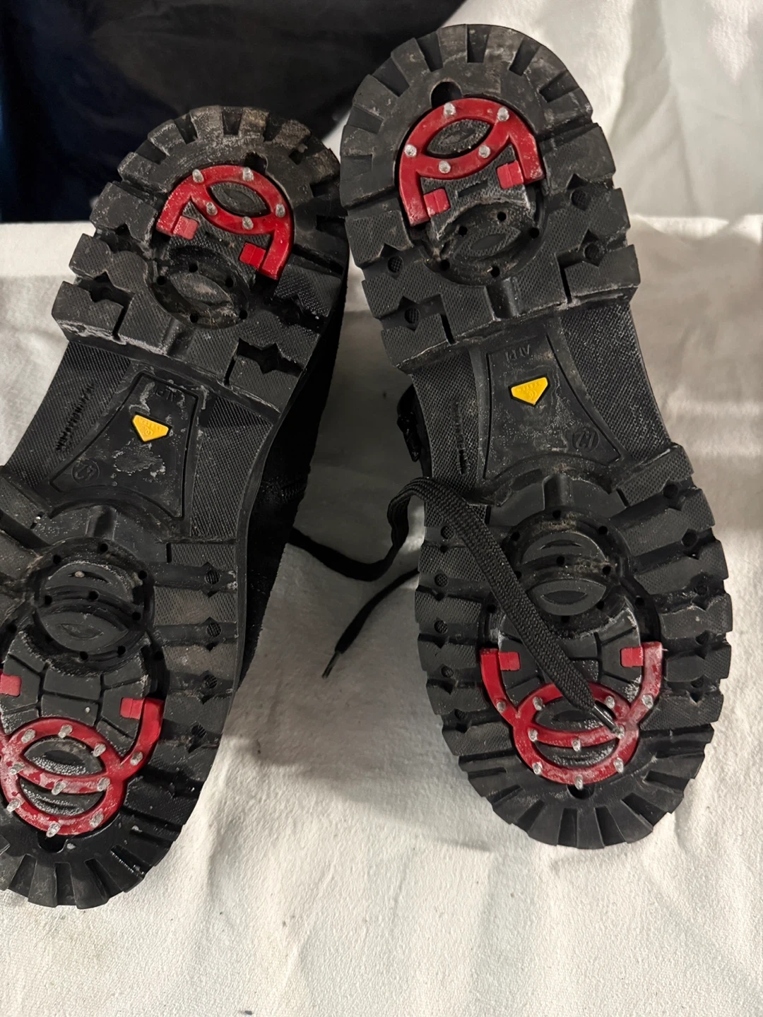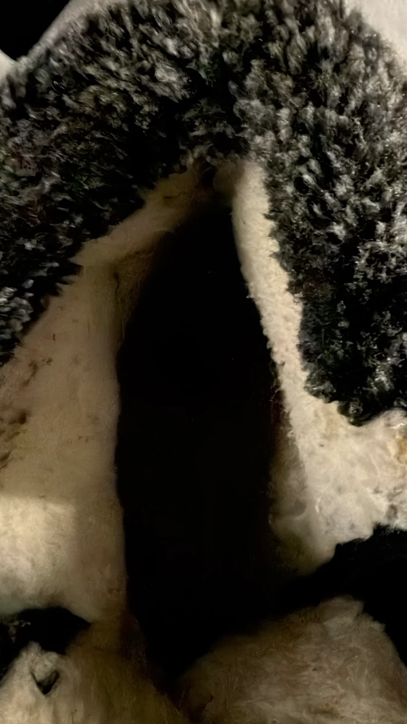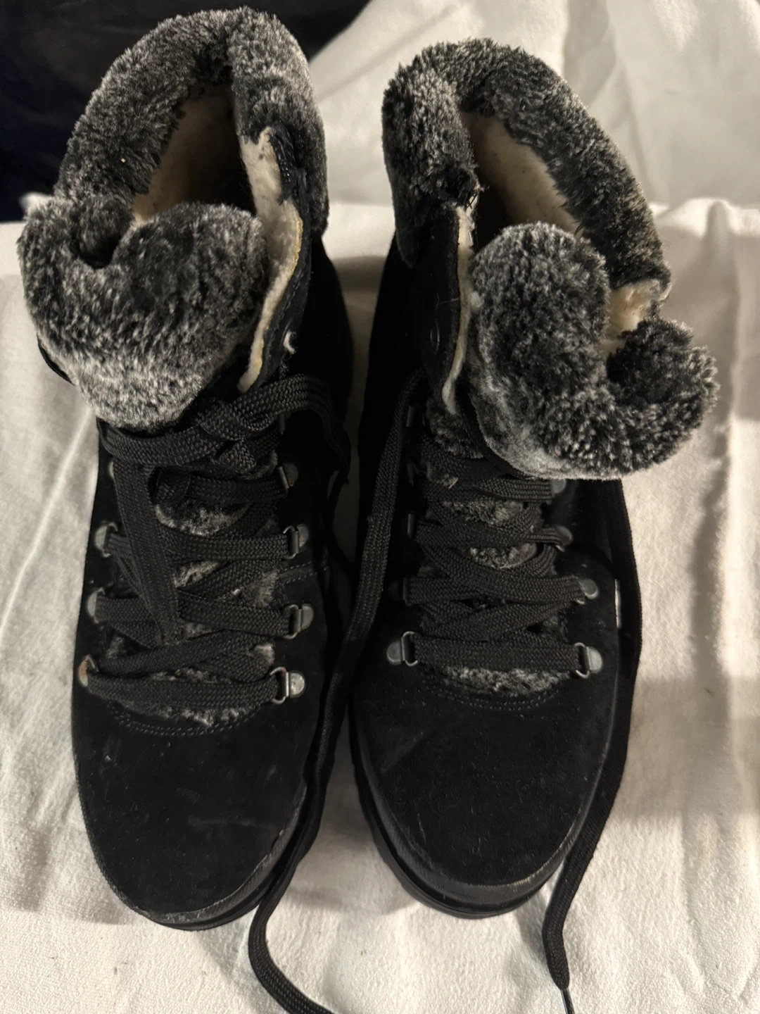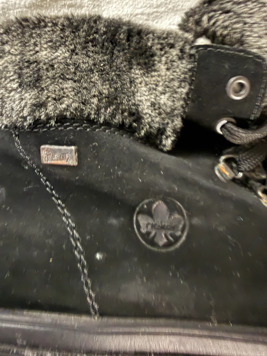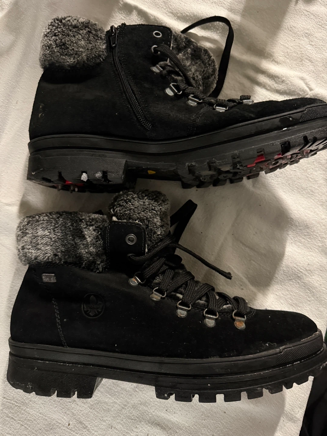 Rieker black suede boots with a cozy faux fur lining. They feature a side zipper and laces for a secure fit. Excellent traction on the soles for winter conditions!