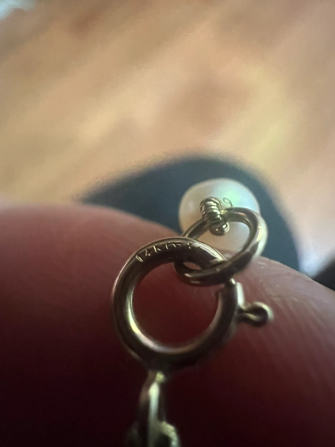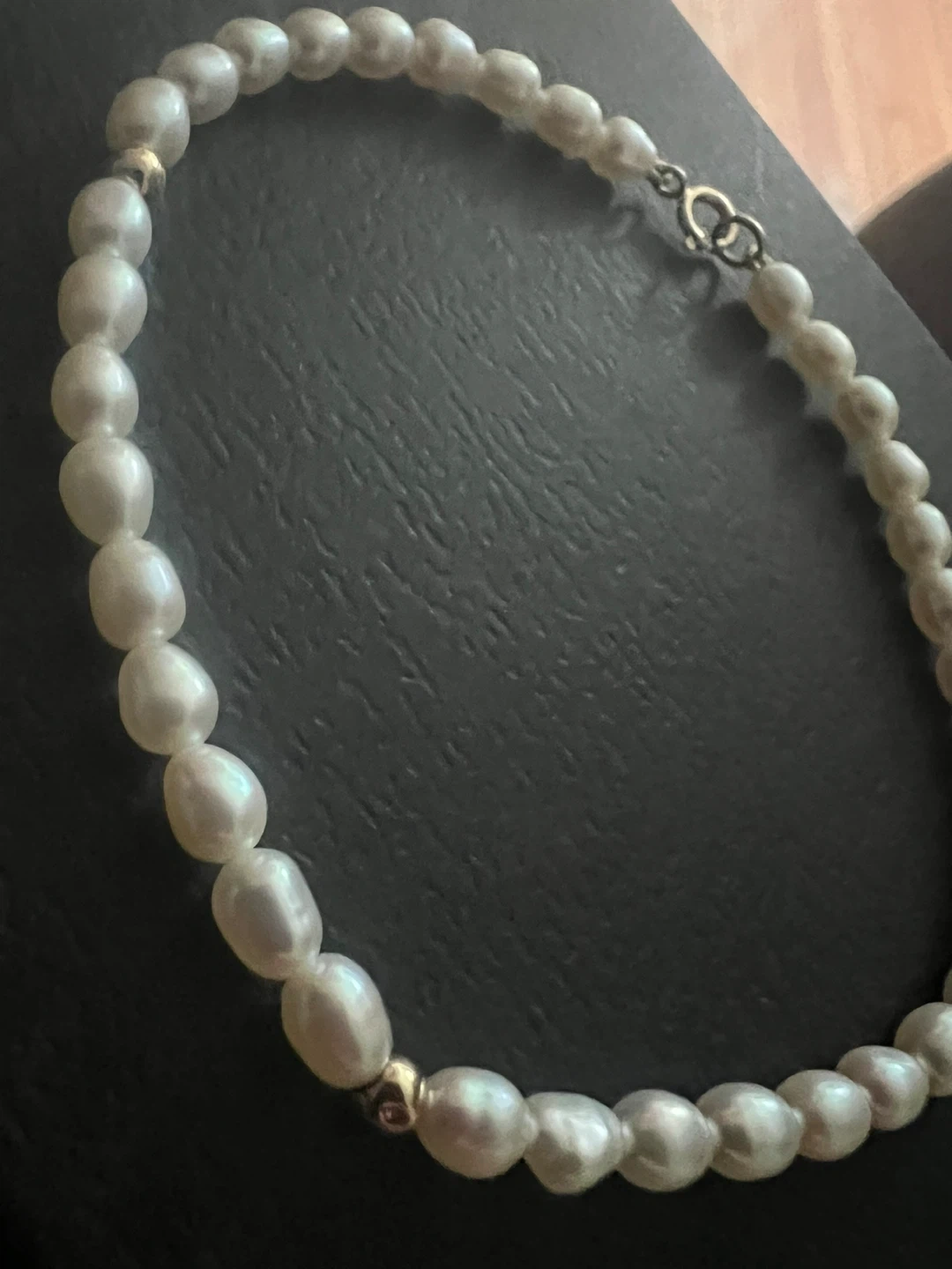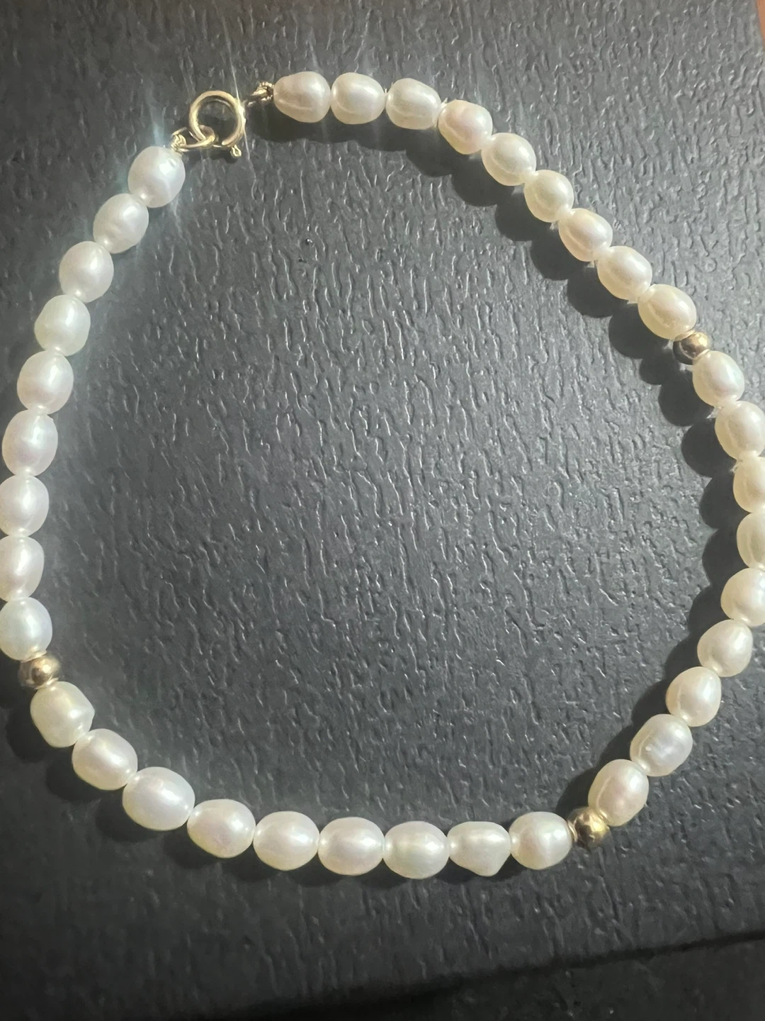This is a delicate bracelet featuring cultured pearls with small gold beads interspersed. It's secured with a 14K gold clasp.