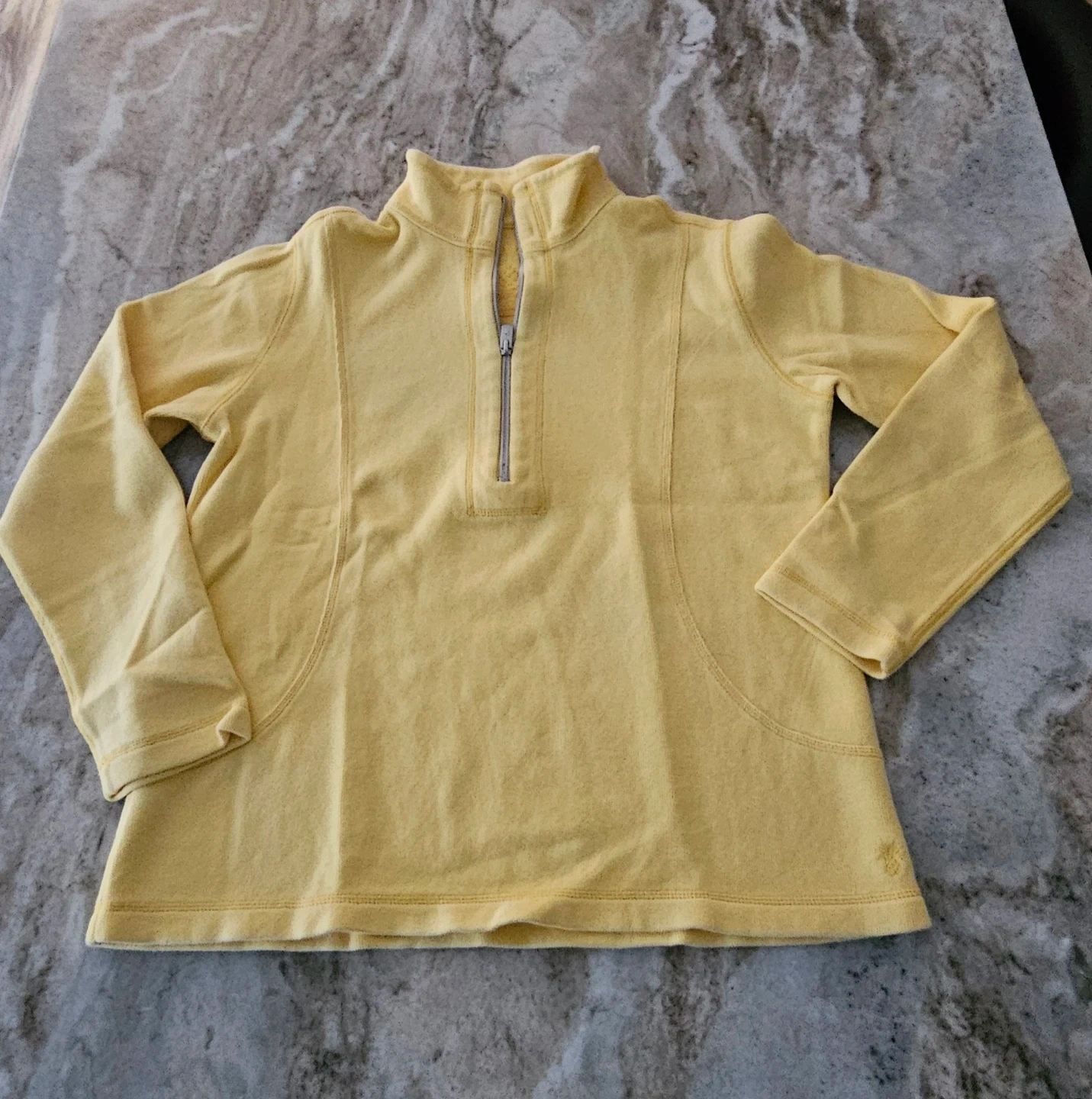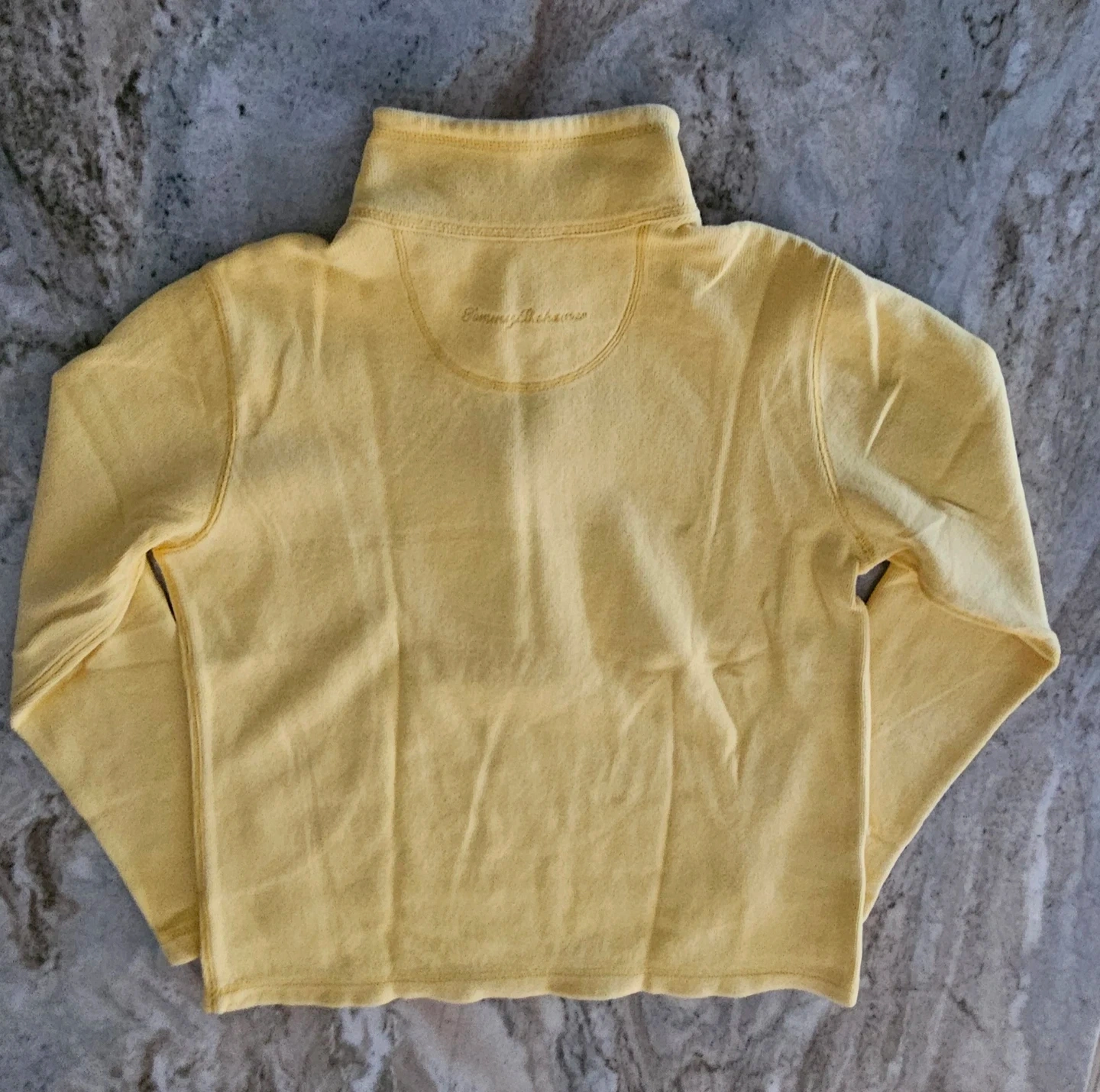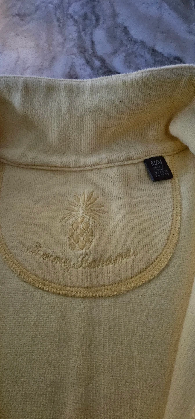 Tommy Bahama women's yellow sweater. It's a size M/M with a 1/4 zip closure and a small embroidered pineapple detail on the chest and zipper pull. Made with a comfortable knit fabric.