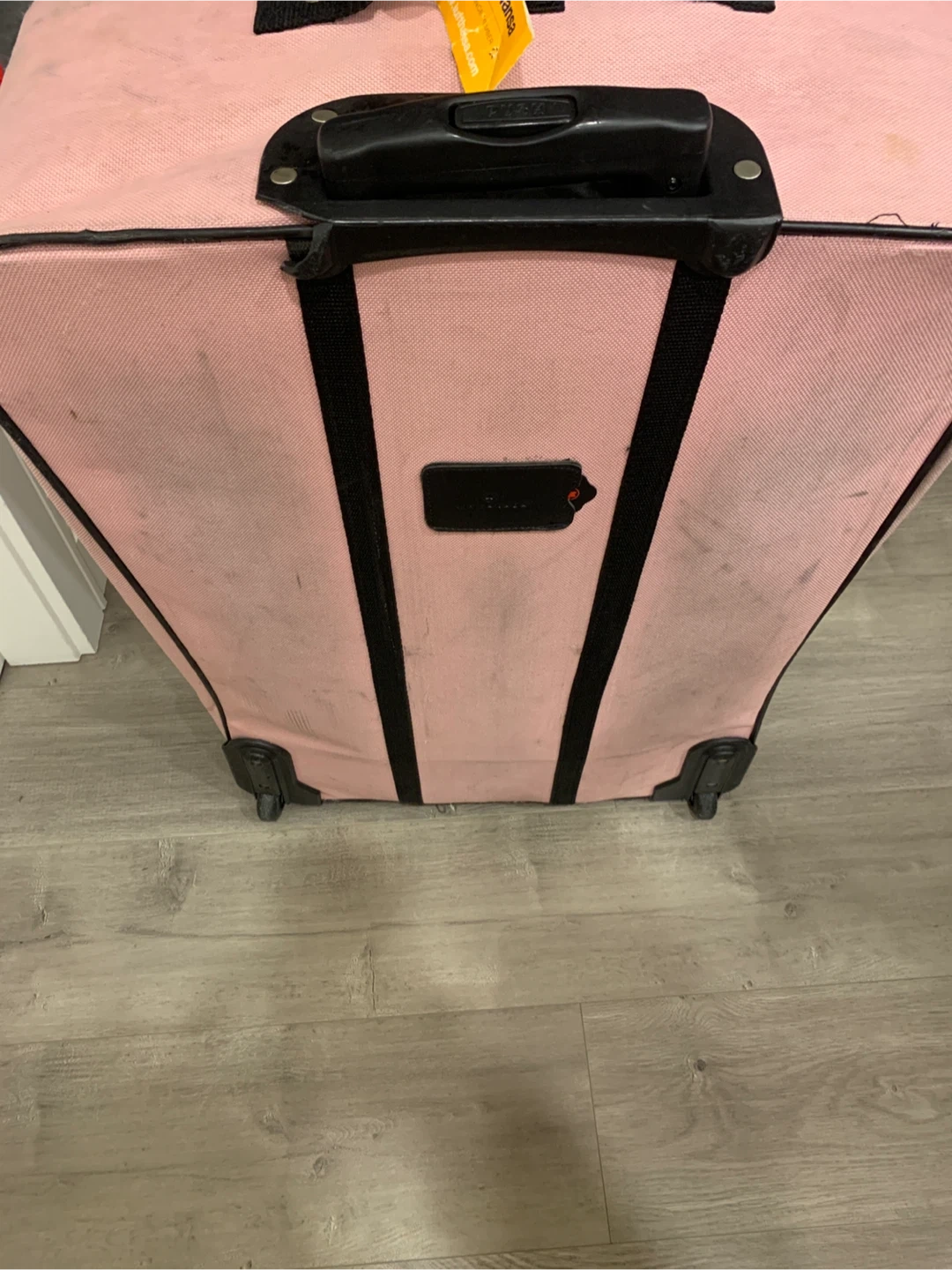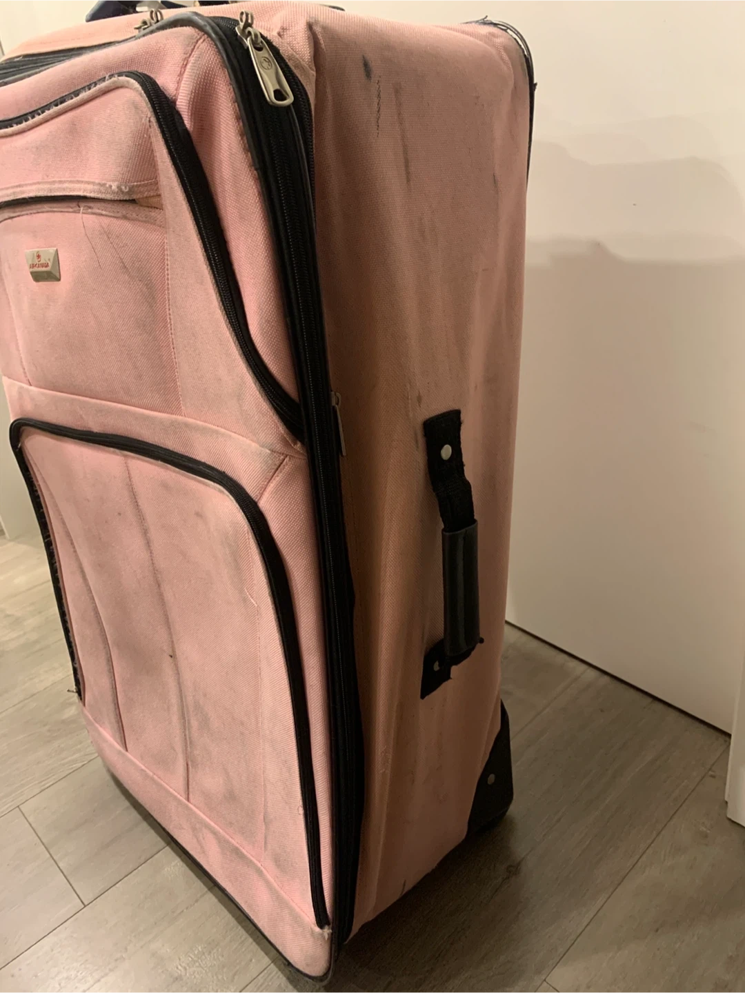 Pink rolling suitcase with black trim and handles. It has multiple zippered compartments. Shows lot of wear with some scuffs and marks from travel. We have been using it for storage now and don’t need it any longer.