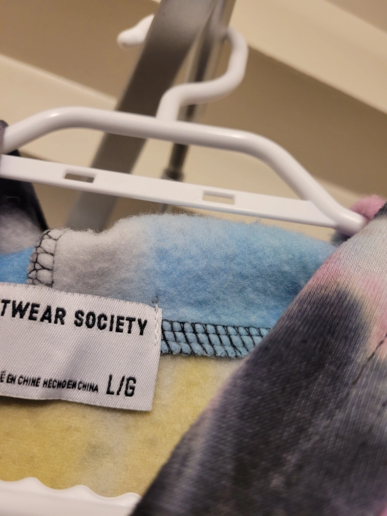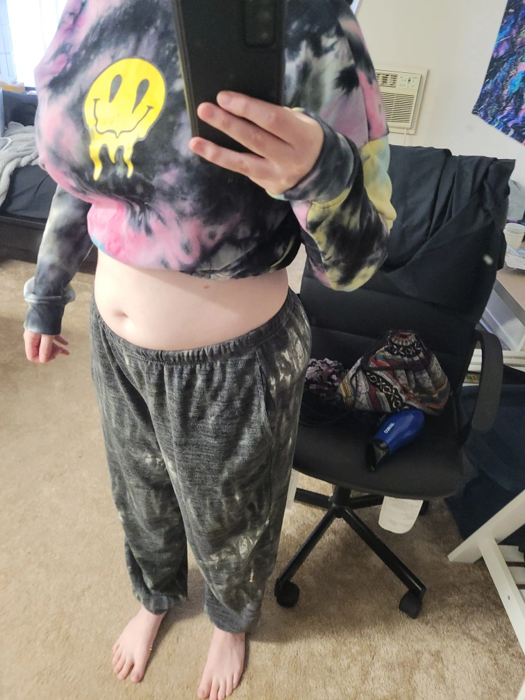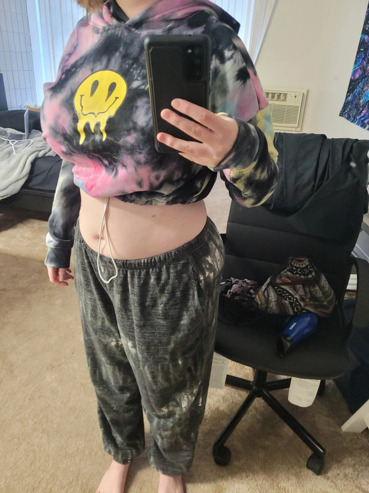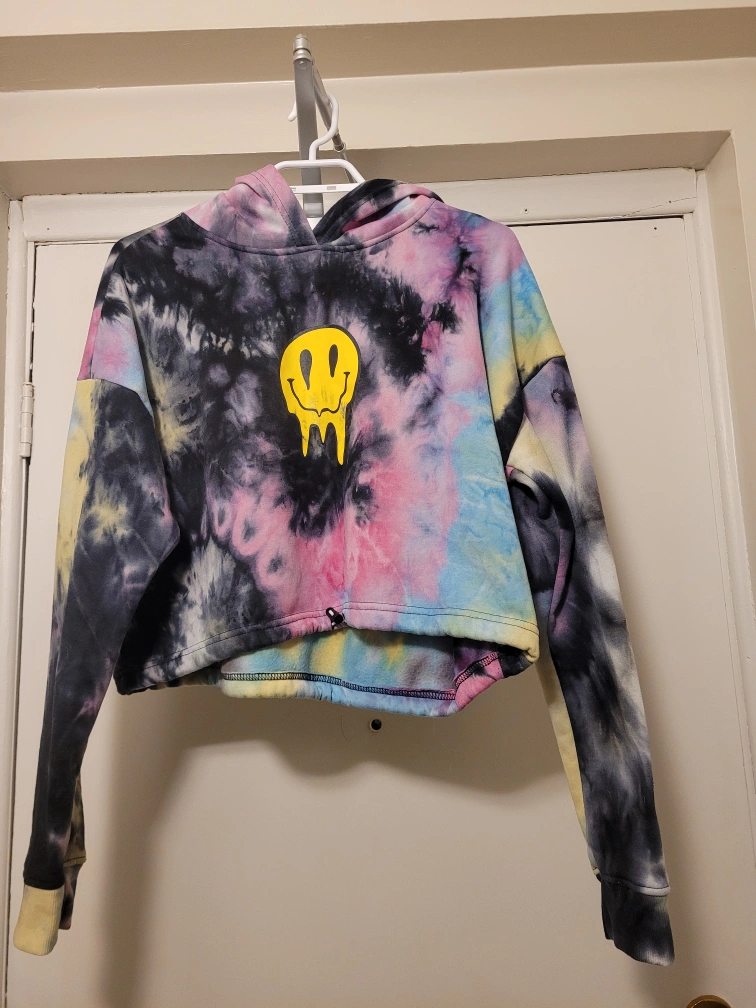 Tie dye hoodie with a melting smiley face. Cropped style when you pull the drawstring at the bottom of the shirt. It is a large, the sleeves are long depending on the person. Got it from Stitches.