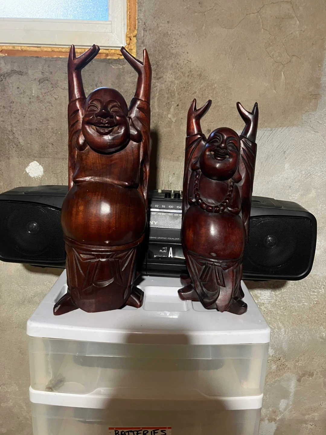 A pair of carved wooden laughing Buddha statues with their arms raised. (12” & 14”) . They're made of a dark wood with a glossy finish. These statues add a touch of serenity and joy to any space. They're great for shelves or mantels.
