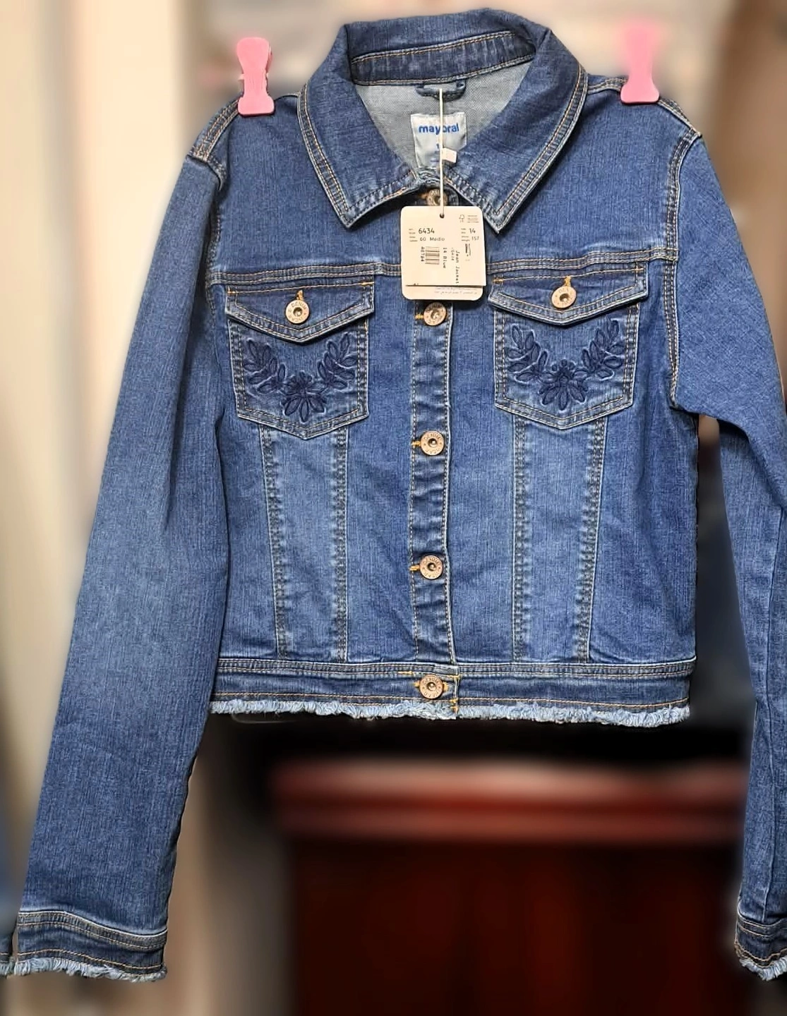Brand New Teens Trendy Long Sleeve Denim Jean Jacket Button Down with Embroidered Pockets Size 14. This Brand New Teen Trendy Long Sleeve Denim Jean Jacket Button Down with Embroidered Pockets is a streetwear staple that provides a contemporary, edgy vibe. Whether thrown over a simple tee or layered with a hoodie, this jacket is sure to make a bold statement. Spring Fall Fashion Teen Jacket. A teen size 14. For pick-up and serious inquiries only.