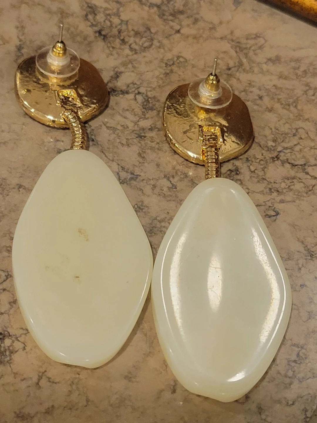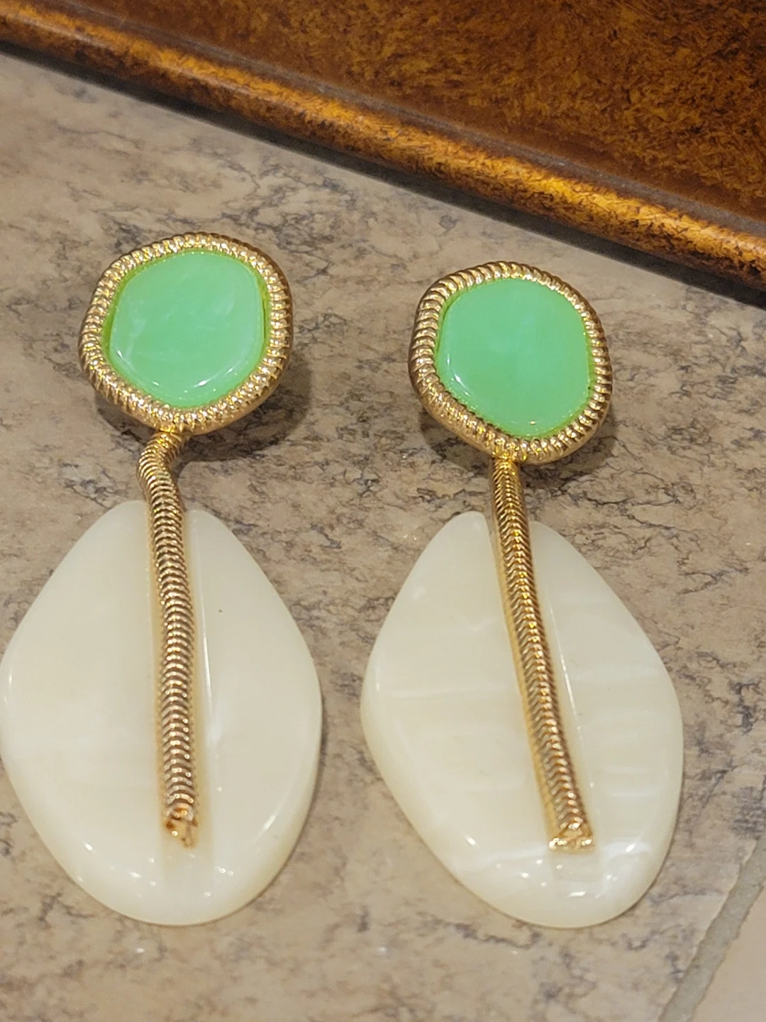 These statement earrings feature a smooth cream-coloured teardrop pendant. They have a small mint green oval top accent with gold-tone detailing. A unique accessory for any outfit! Pickup location eglinton and dufferin area