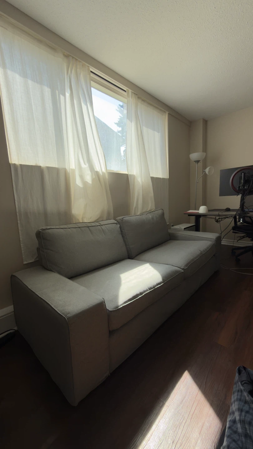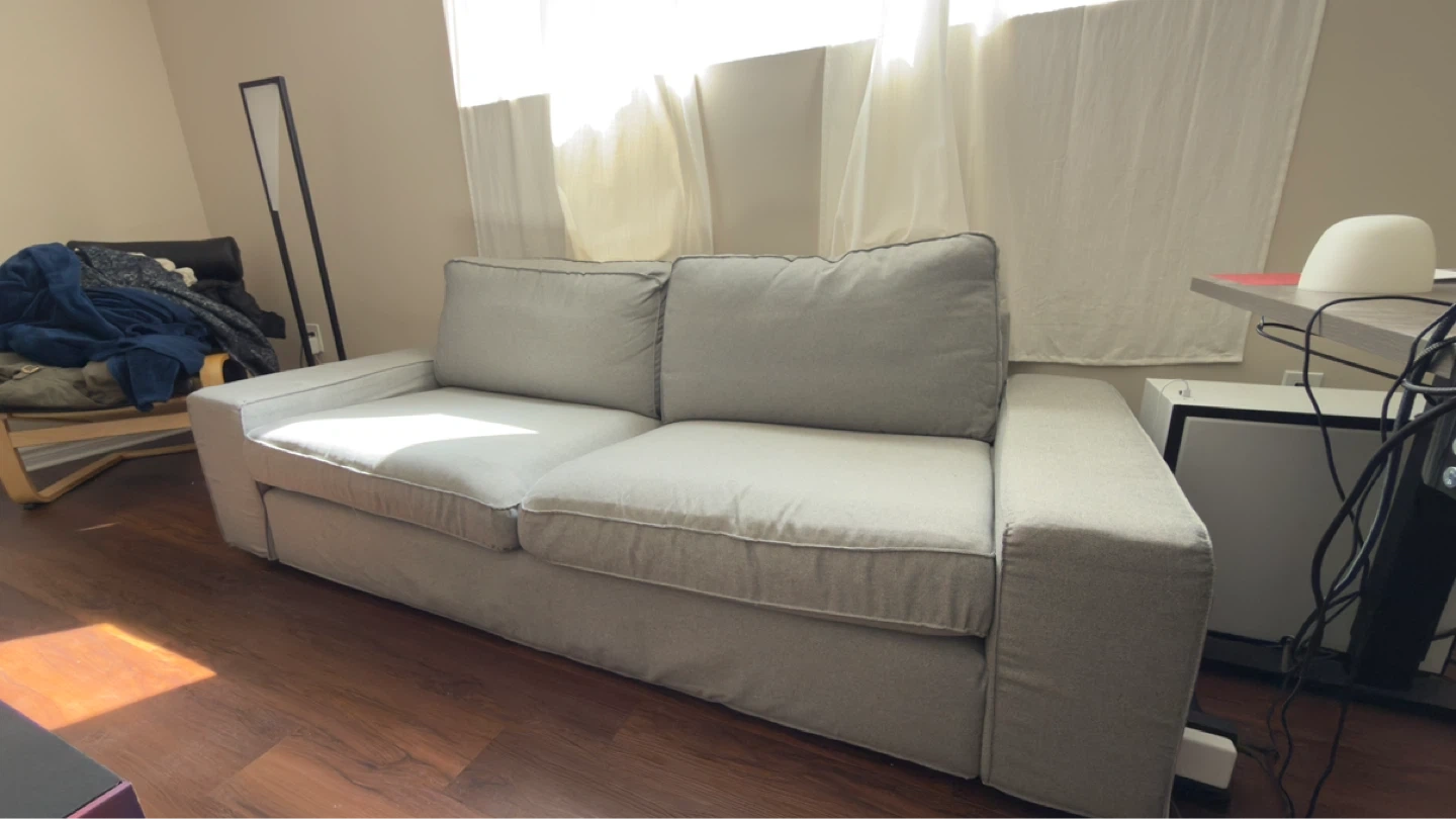 This is a light grey two-seater sofa. It's upholstered in a durable fabric with a subtle herringbone pattern. The sofa features comfortable seat and back cushions with piping detail. It's a nice addition for any living space!