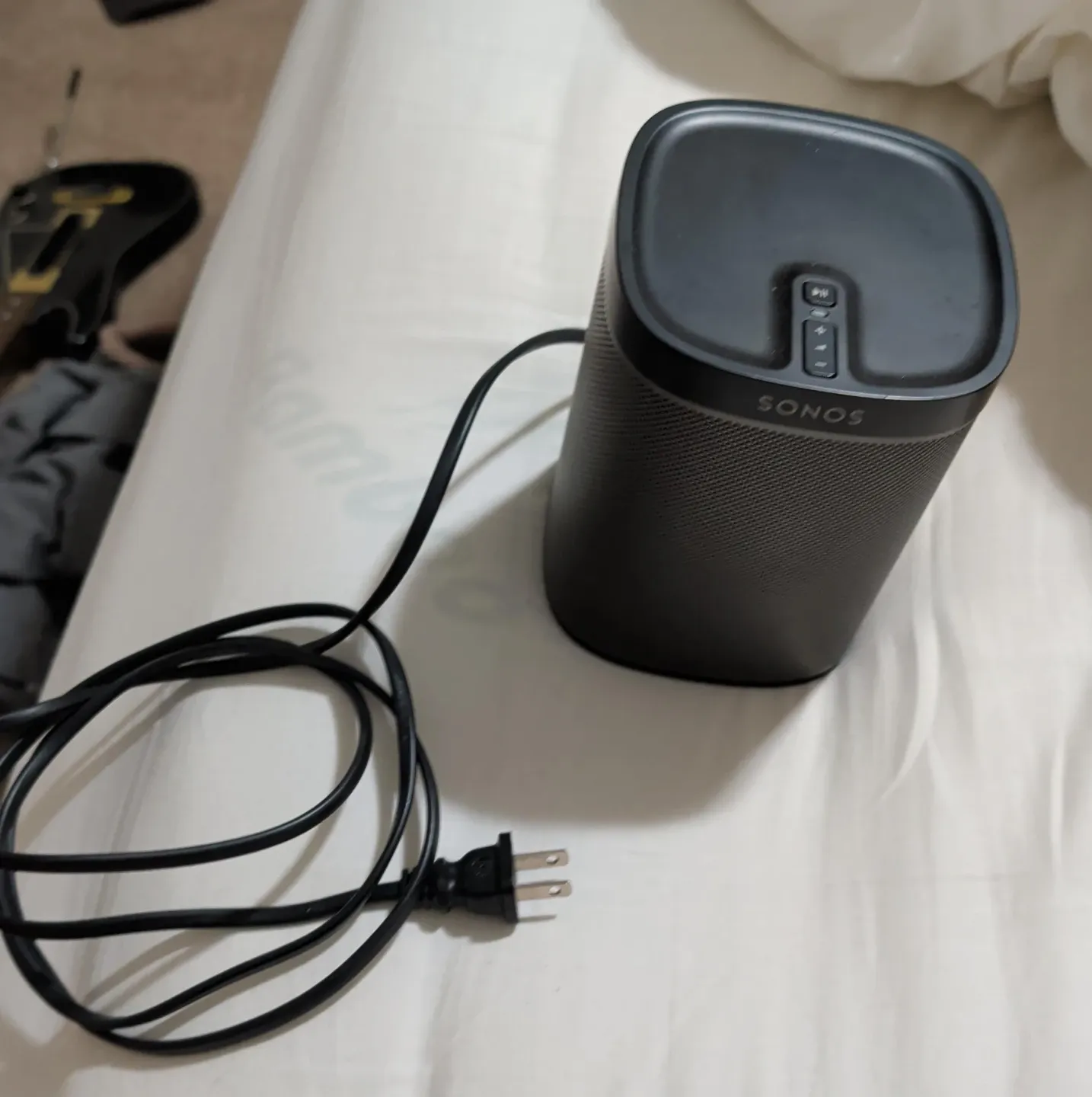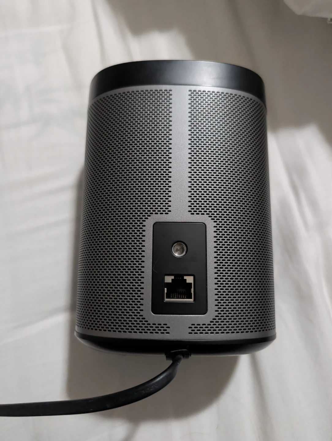 Sonos PLAY:1 smart speaker in black. Compact design with excellent sound. Connects via Wi-Fi and Ethernet. Includes power cord.