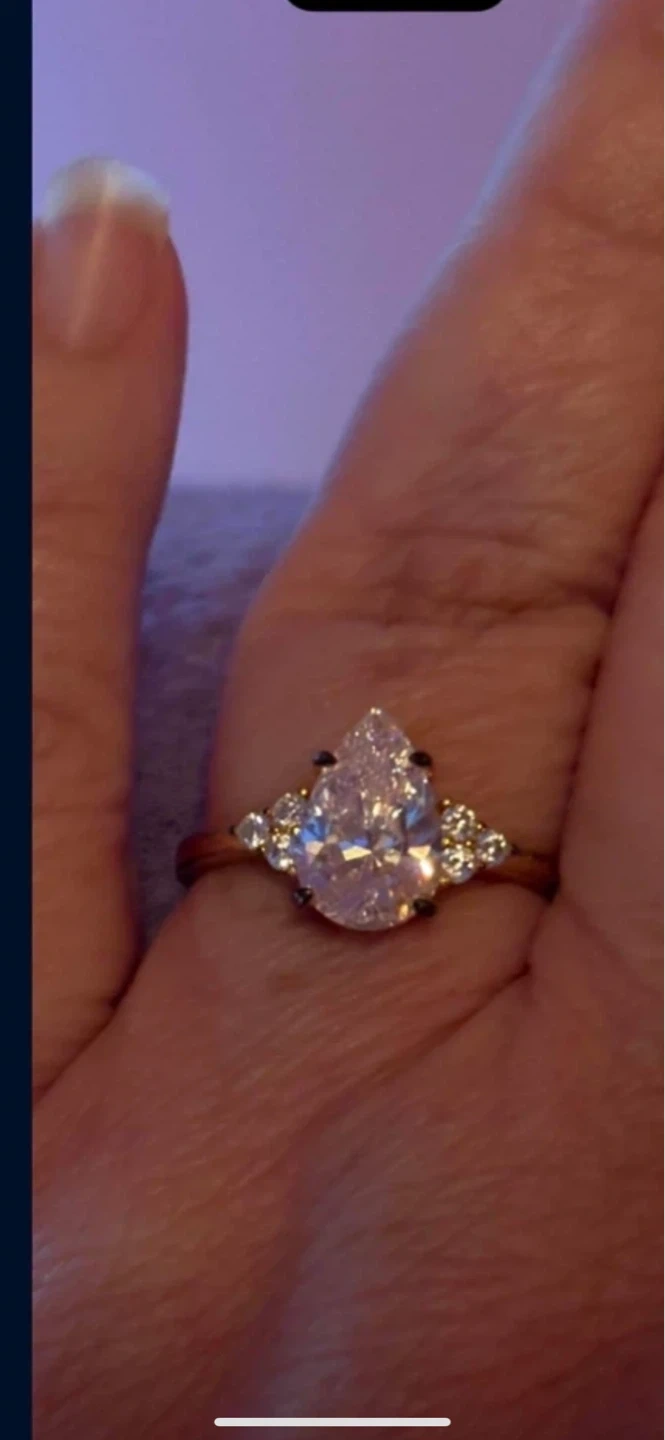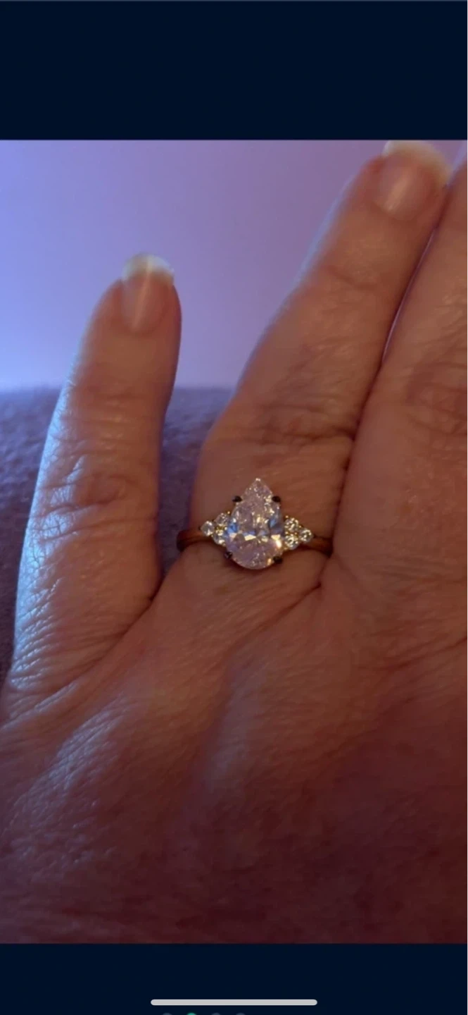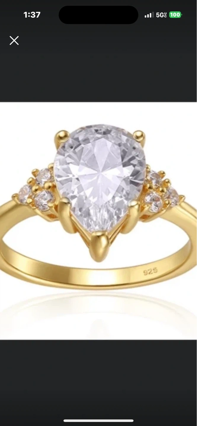 This stunning gold ring features a pear-cut center stone with smaller accent stones on the band. It's crafted from sterling silver and has a beautiful gold finish. Perfect for anniversaries or as a special gift! Size 11