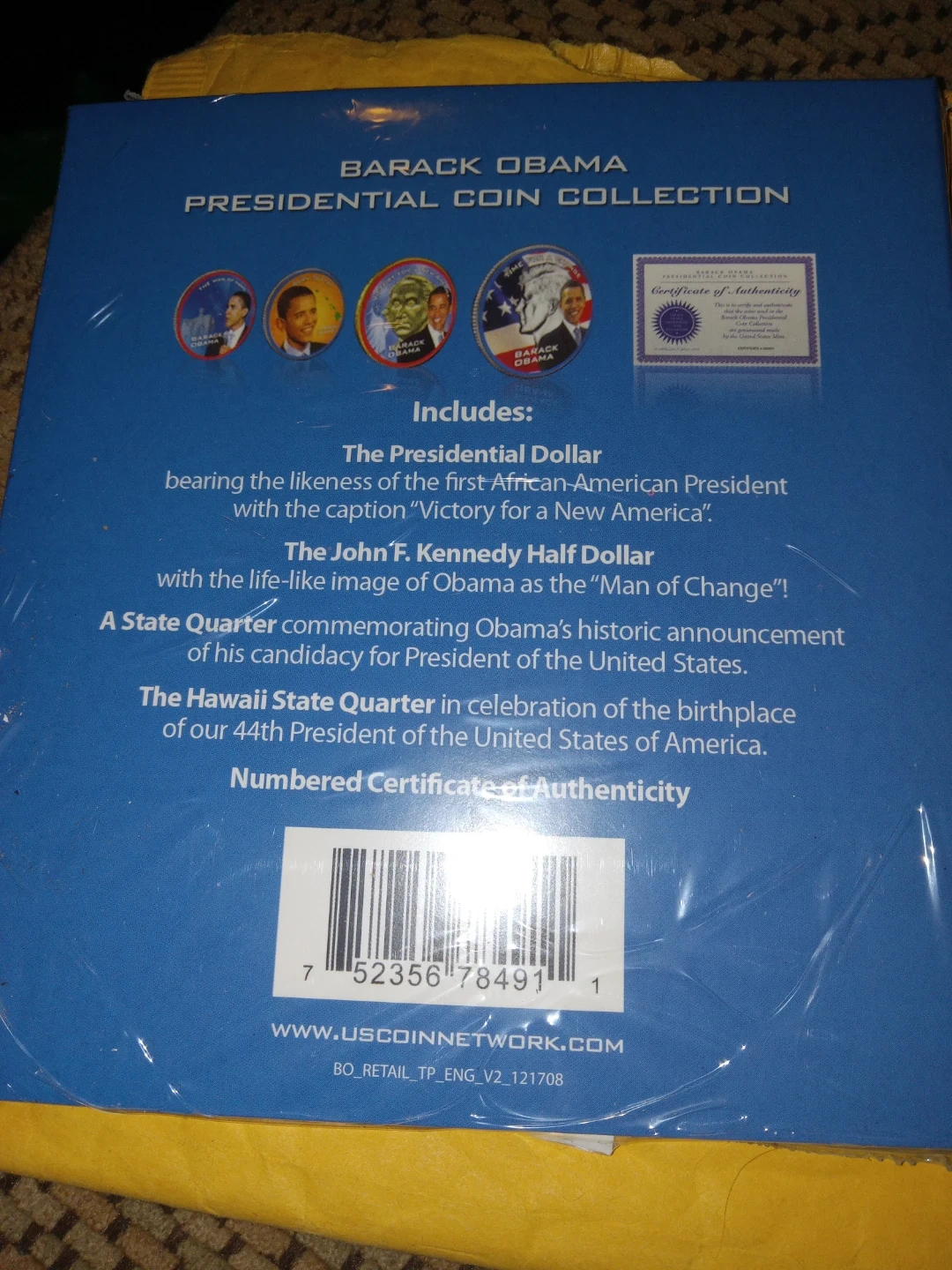 Selling a Barack Obama Presidential Coin Collection. It includes: The Presidential Dollar, The John F. Kennedy Half Dollar, A State Quarter, and a Numbered Certificate of Authenticity