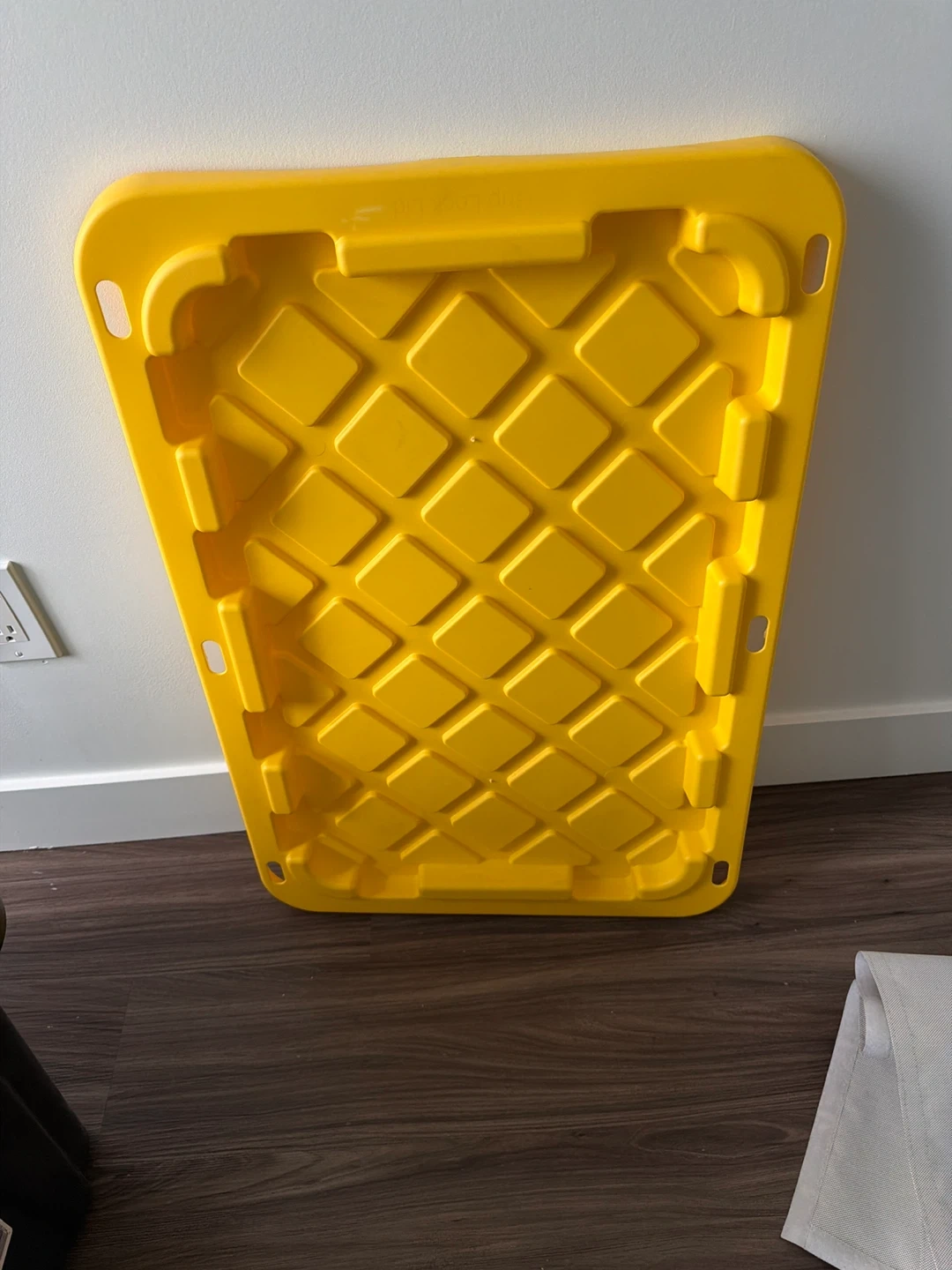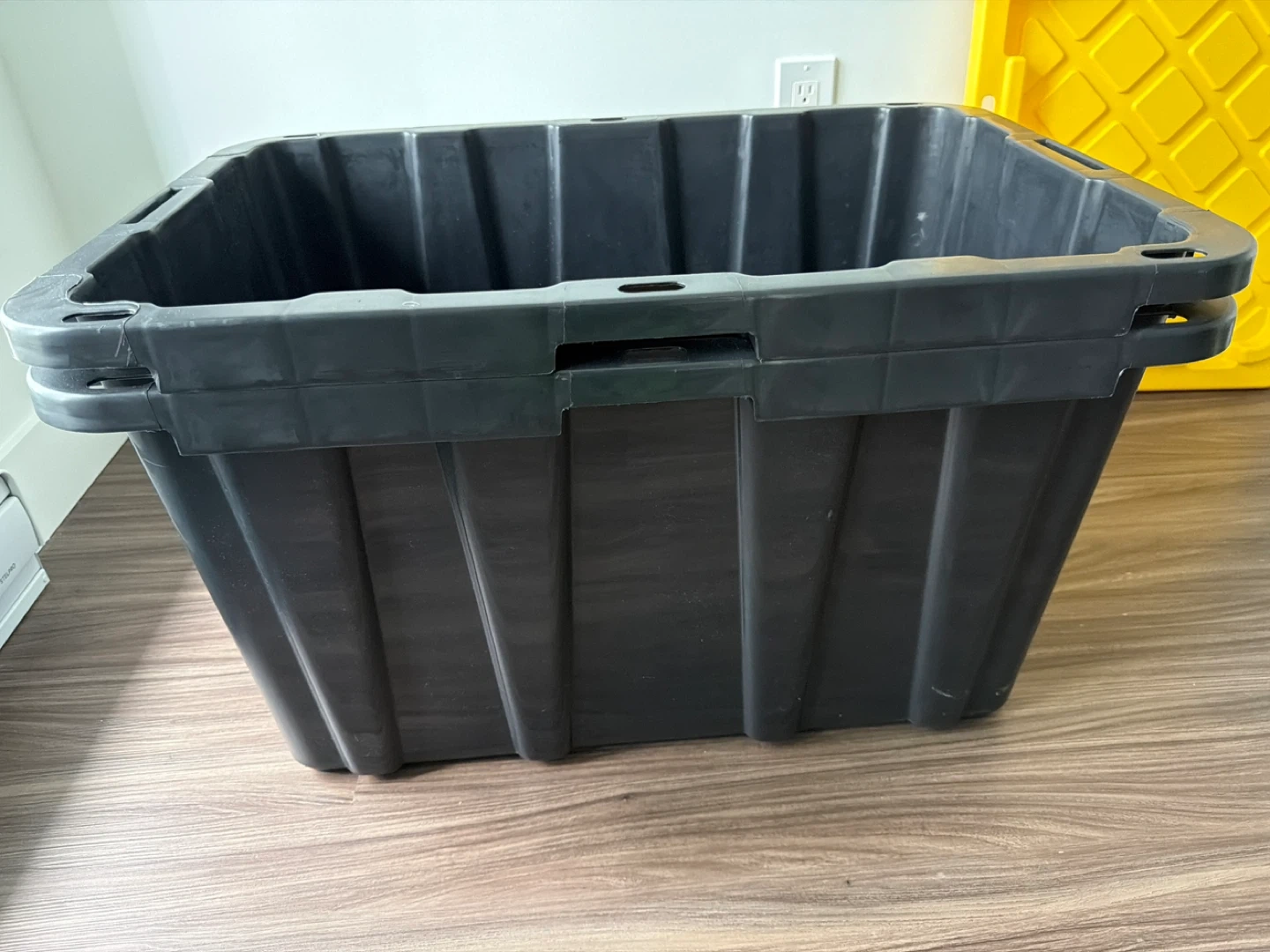 Heavy-duty black plastic storage bin. Includes a yellow snap-on lid for secure closure. Great for organizing garages or basements. There’s two of them.