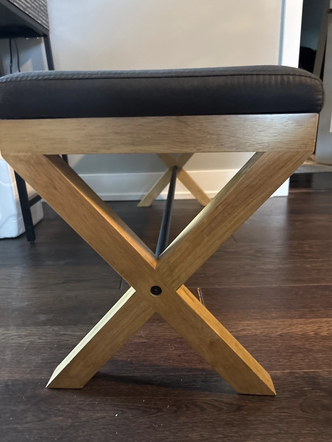 A stylish bench with a black faux leather seat and a natural wood frame featuring unique X-shaped legs. It has a sturdy metal support bar connecting the legs for added stability. This bench is perfect for an entryway or at the foot of a bed.