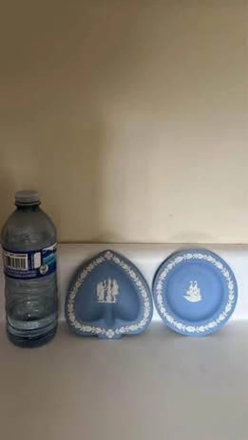 Two Wedgwood Blue Jasperware trinket dishes. One is round and features the Mayflower. The other is heart-shaped. Made in England. Collectible items.