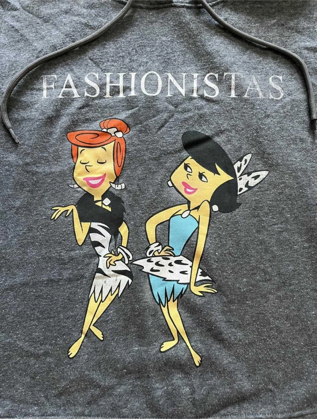 Women’s small licensed The Flintstones hoodie in grey with Wilma Flintstone and Betty Rubble ‘Fashionistas’ graphic. Pullover with drawstring hood. Excellent condition. 65% polyester, 35% cotton.