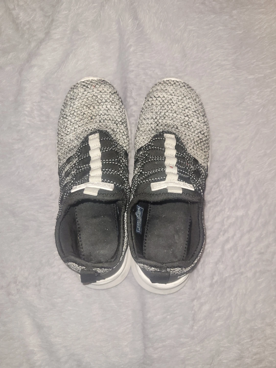These Nautica sneakers are a stylish black and white knit. They feature a slip-on design with elastic laces. Great for everyday wear!
