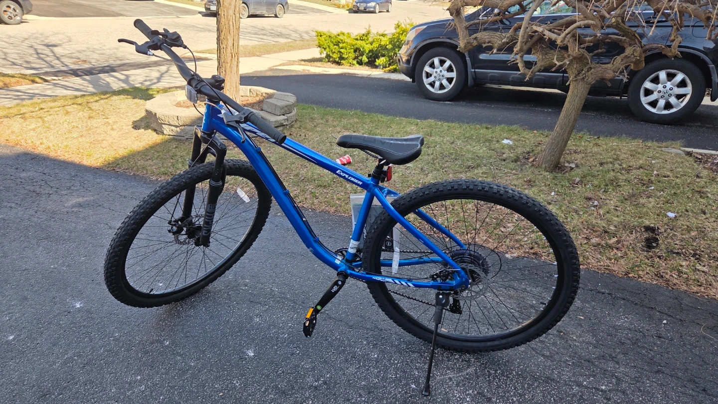 Blue aluminum frame mountain bike with 29-inch wheels. Features a 9-speed trigger shifter with Shimano rear derailleur and alloy wheels. It has a premium padded and adjustable saddle. This bike is perfect for hitting the trails!