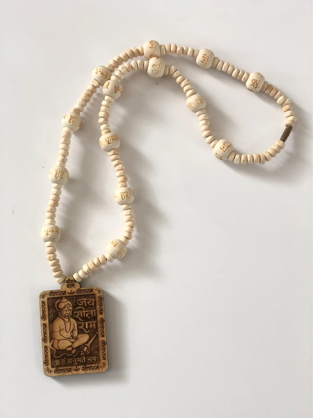 It is a mala with tulsi beads together with a pendant depicting Hanuman. The pendant is engraved with religious text and imagery. It's a spiritual accessory made of wood.