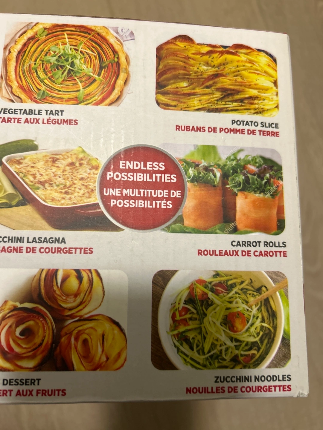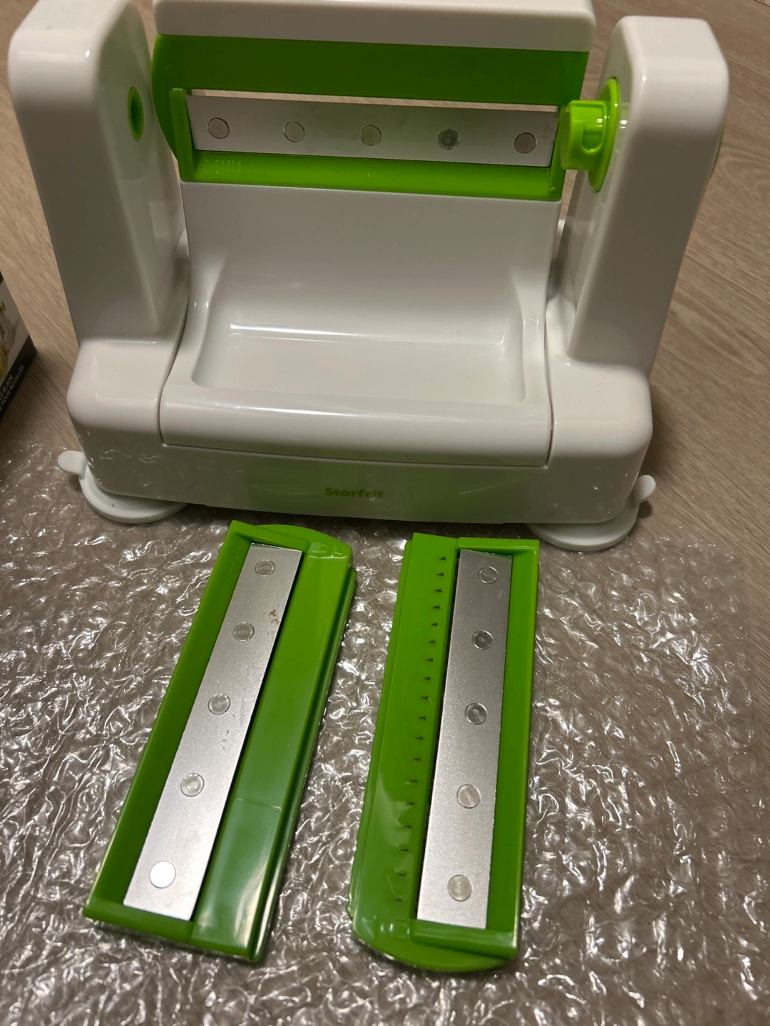 This Starfrit fruit and vegetable sheet slicer is great for making healthy snacks and low-carb meals. It comes with 3 blades for different cuts, including a noodle blade. The slicer is white and green.