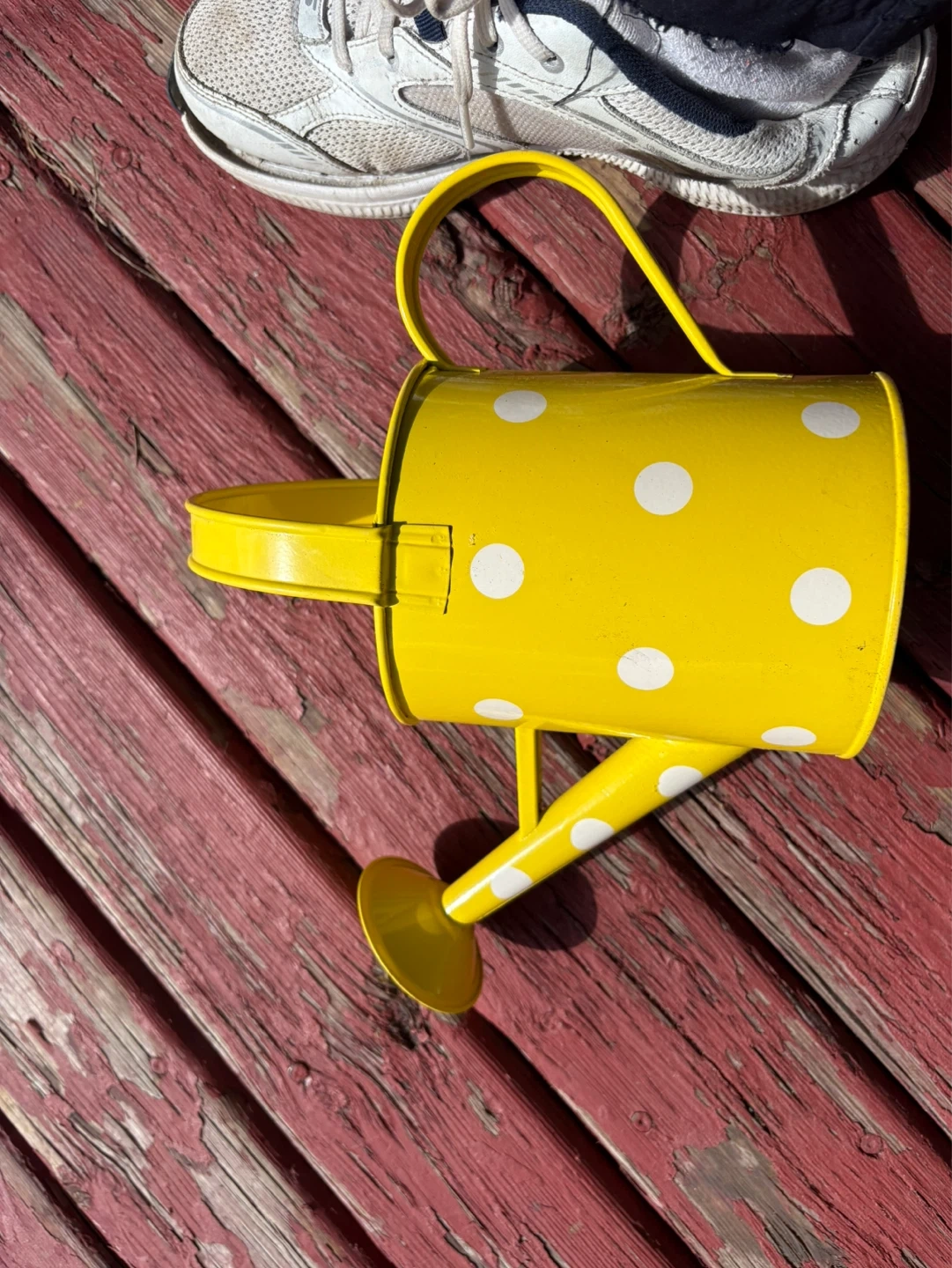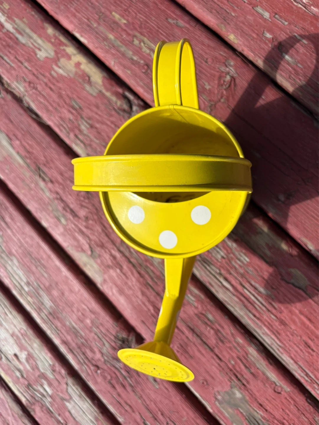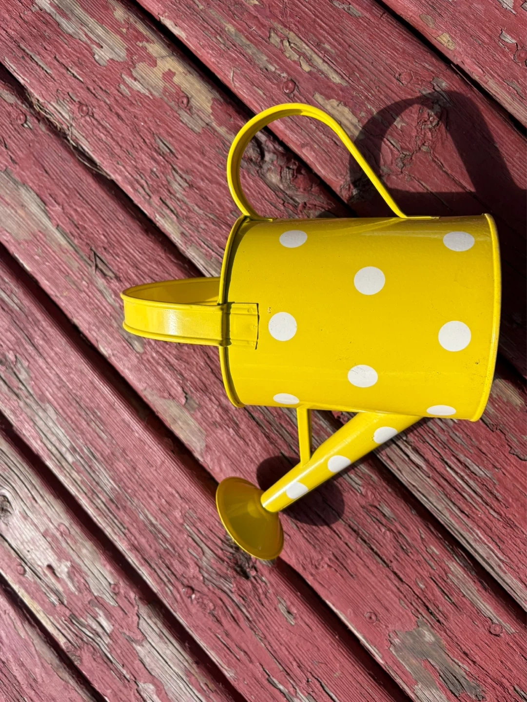 A cute yellow metal watering can with white polka dots. It's perfect for indoor or outdoor plants! Metal construction.pickup at Morley trail NW