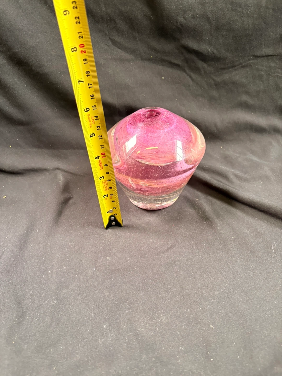This is a beautiful hand-blown glass art vase with a vibrant pink and purple swirl design. It's approximately 5 inches tall and 4 inches wide at its widest point. Glass material.
