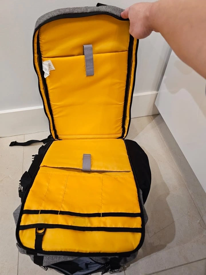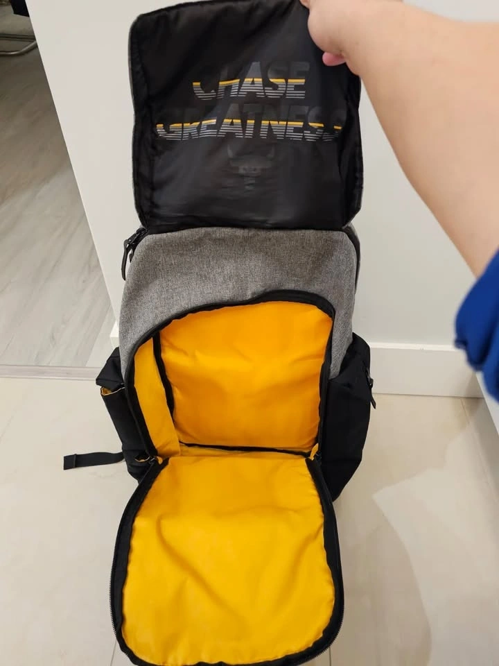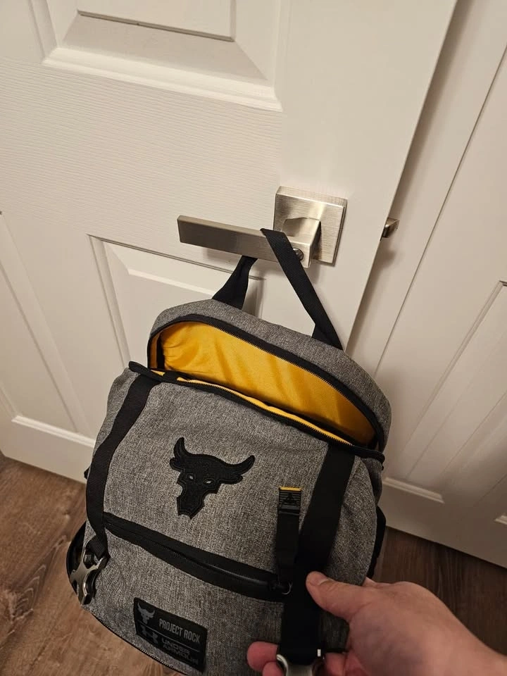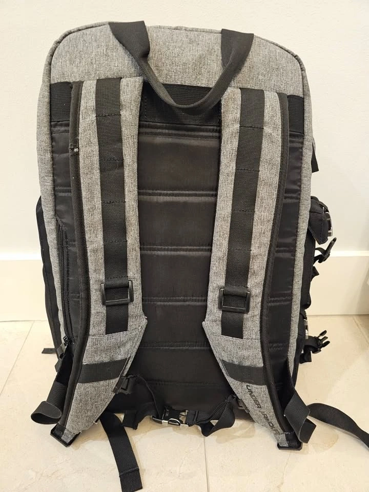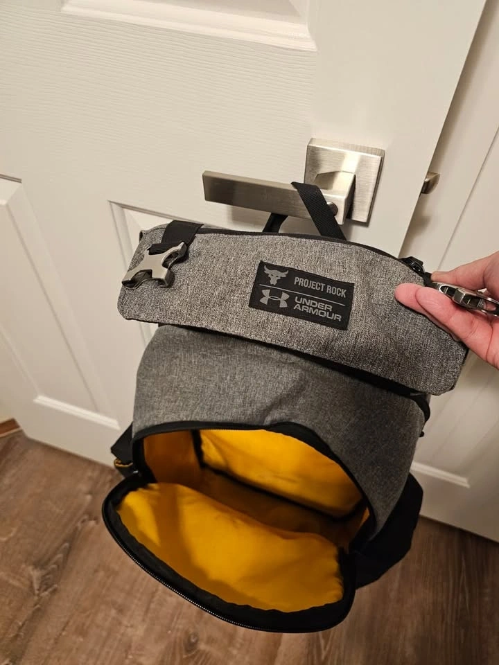 Selling a discontinued Under Armour Project Rock Vanish Regiment Backpack with heavy-duty metal cobra-style buckles (not plastic). This is a rugged bag suitable for gym, travel, school, or work. It features a high-visibility yellow interior and a padded laptop sleeve. The bag is clean, with no stains or smells, and comes from a smoke-free home. It is structurally solid and 100% functional.