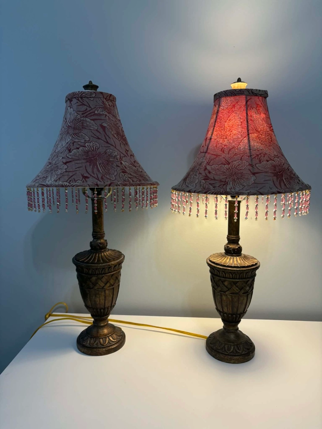 Selling a pair of decorative table lamps! They have a unique design with patterned shades and beaded trim. The lamp bases have an ornate, vintage-inspired look. They would make a lovely addition to any room!