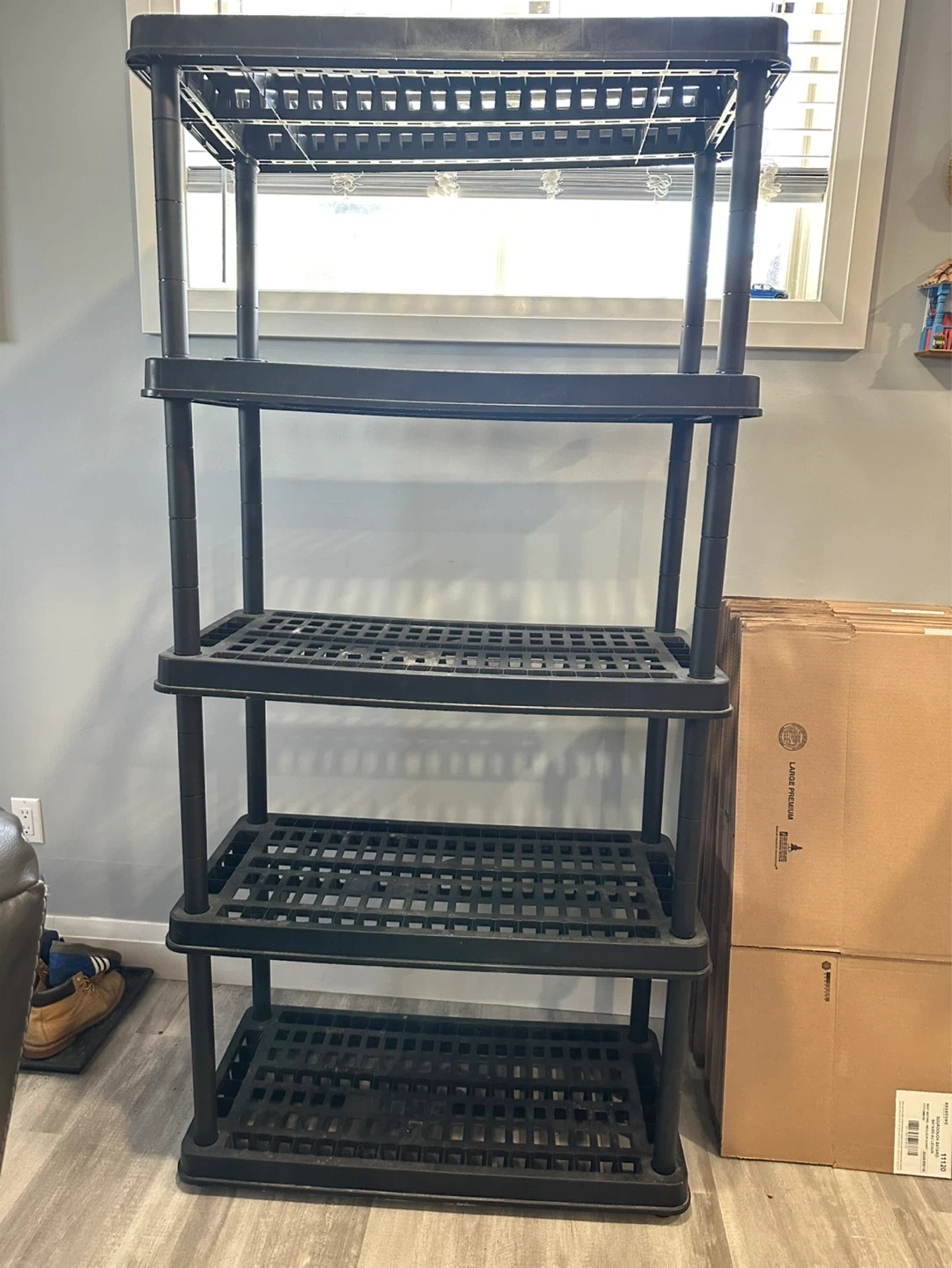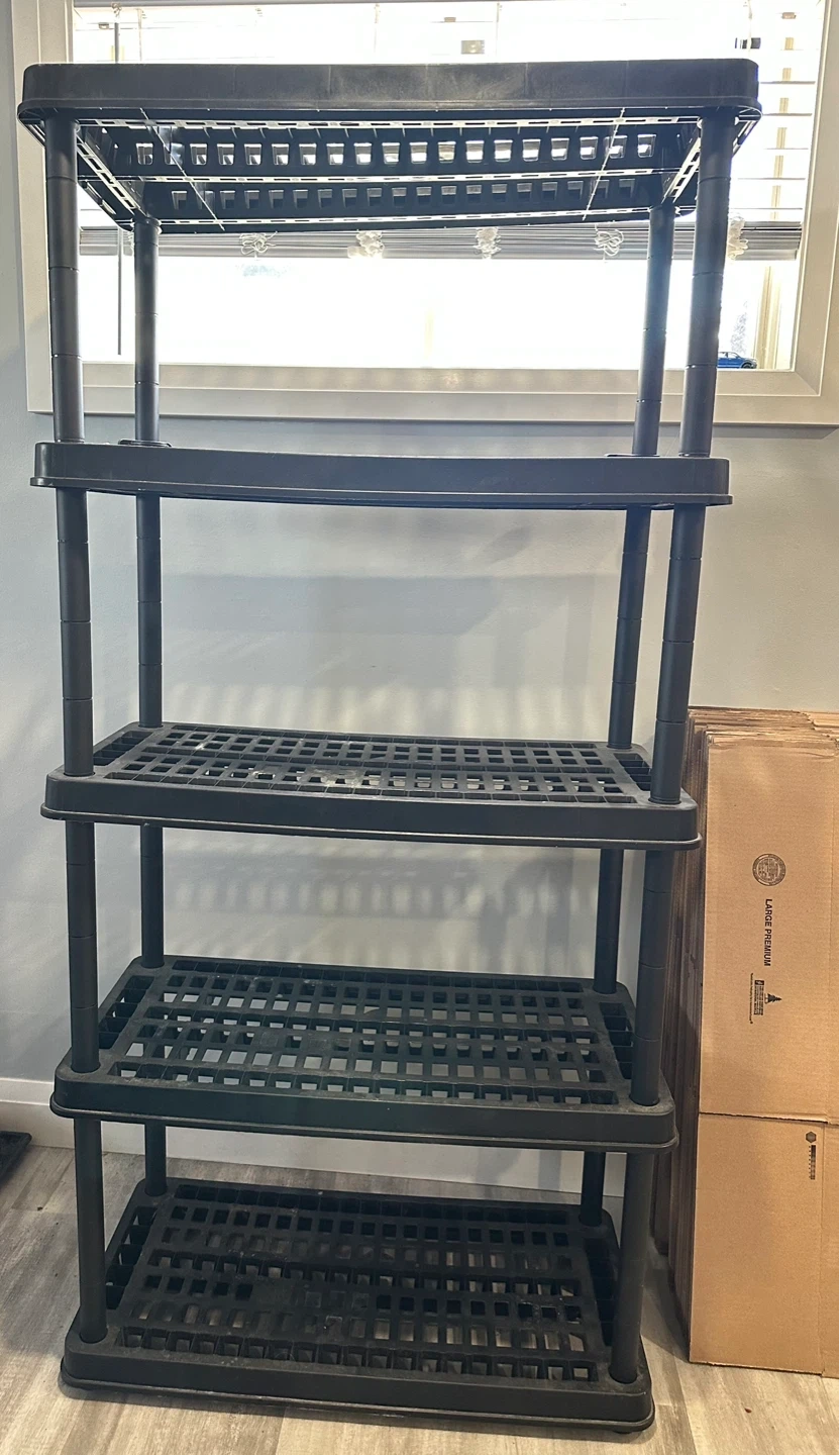Black 5-shelf plastic shelving unit. It's great for organizing garages, basements, or workshops. Each shelf has a slatted design.