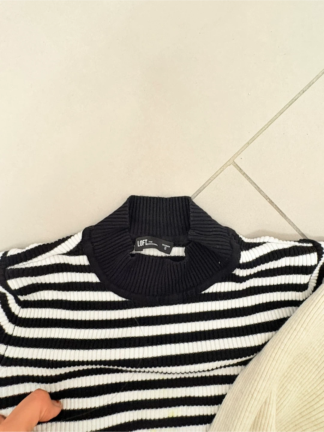 Black and white striped sweater from LOFT. It's a mock neck style with short sleeves. Made from a ribbed knit material.