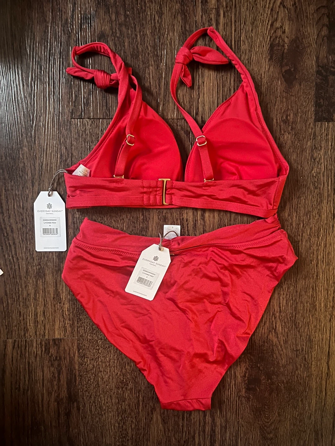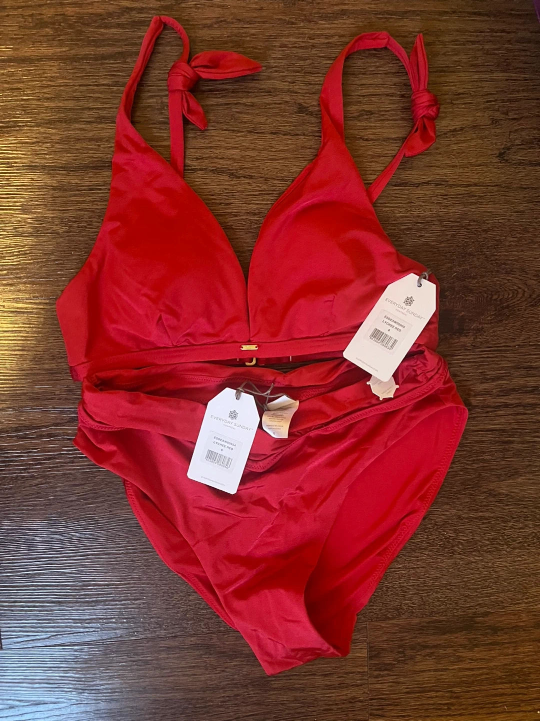 Brand new with tags. Red bikini set from Everyday Sunday. Size small / size 6, see size chart. Removable cups. It features a classic triangle top with adjustable tie straps and ruched high-waisted bottoms. The top has gold hardware detail.