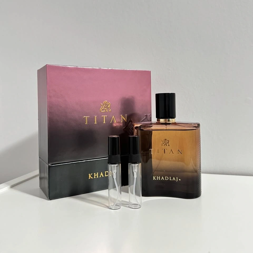 This is a 5ml travel spray decant of Khadlaj Titan, known for its "Stronger With You" DNA. The scent profile includes Sage, Apple, Ginger, Geranium, Aldehydes, Tonka Bean, Cedar, and Olibanum. Let me know if you're interested!