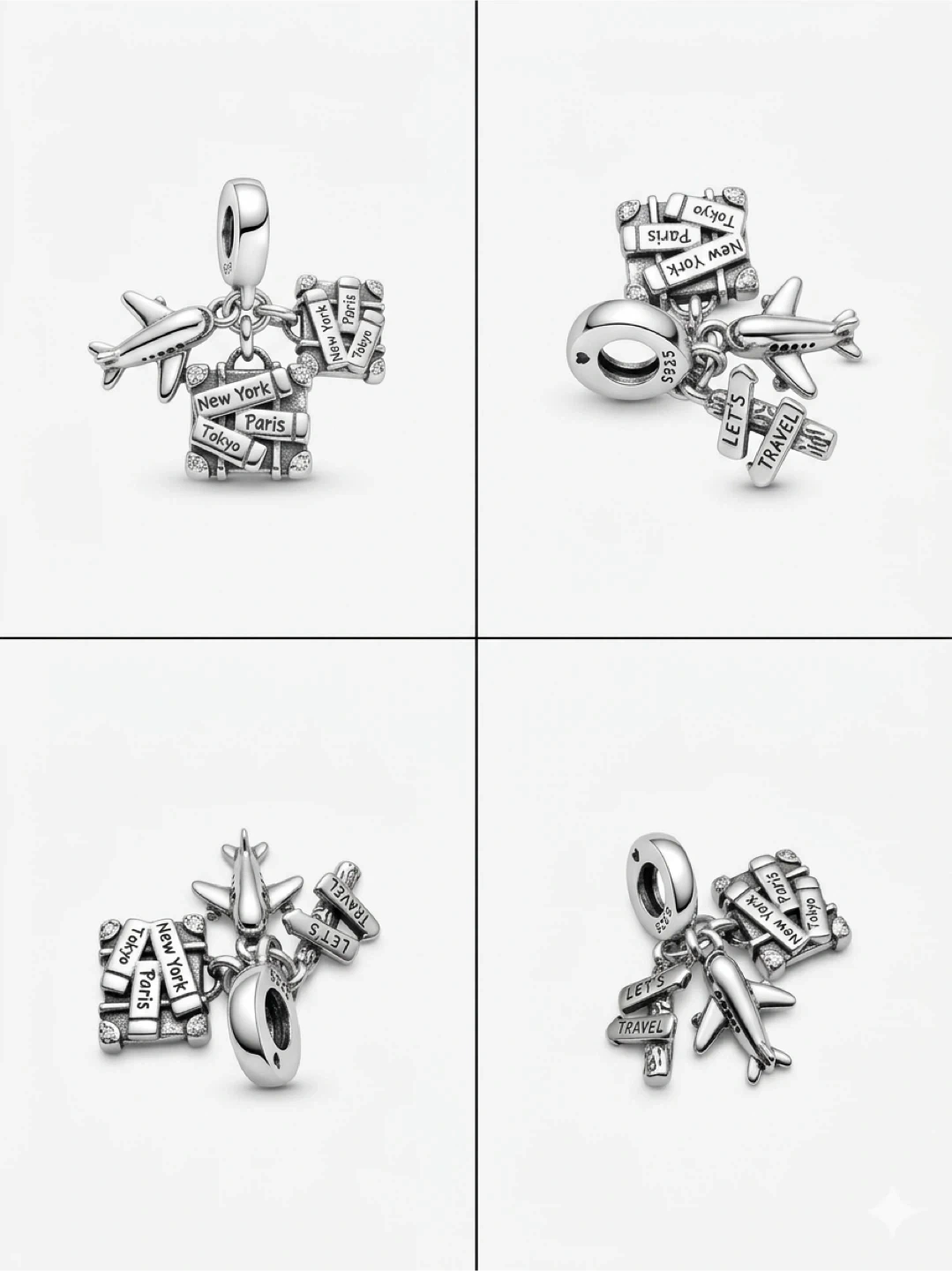 ✈️This sterling silver 925 charm features an airplane, a 'Let's Travel' signpost, and a suitcase. The suitcase is adorned with the names 'New York', 'Paris', and 'Tokyo'. It's made of sterling silver and is perfect for adding to a bracelet.