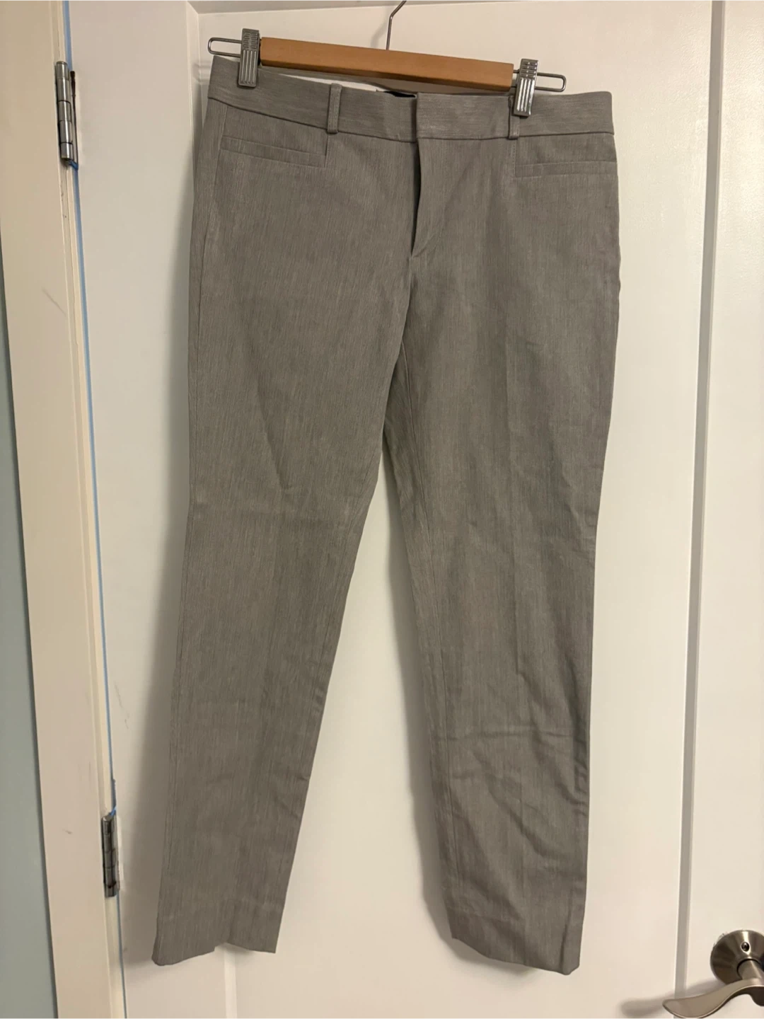 Banana Republic Sloan drop dress pants in a light grey colour. Size is 4. These would be useful for a professional setting or business casual wear.