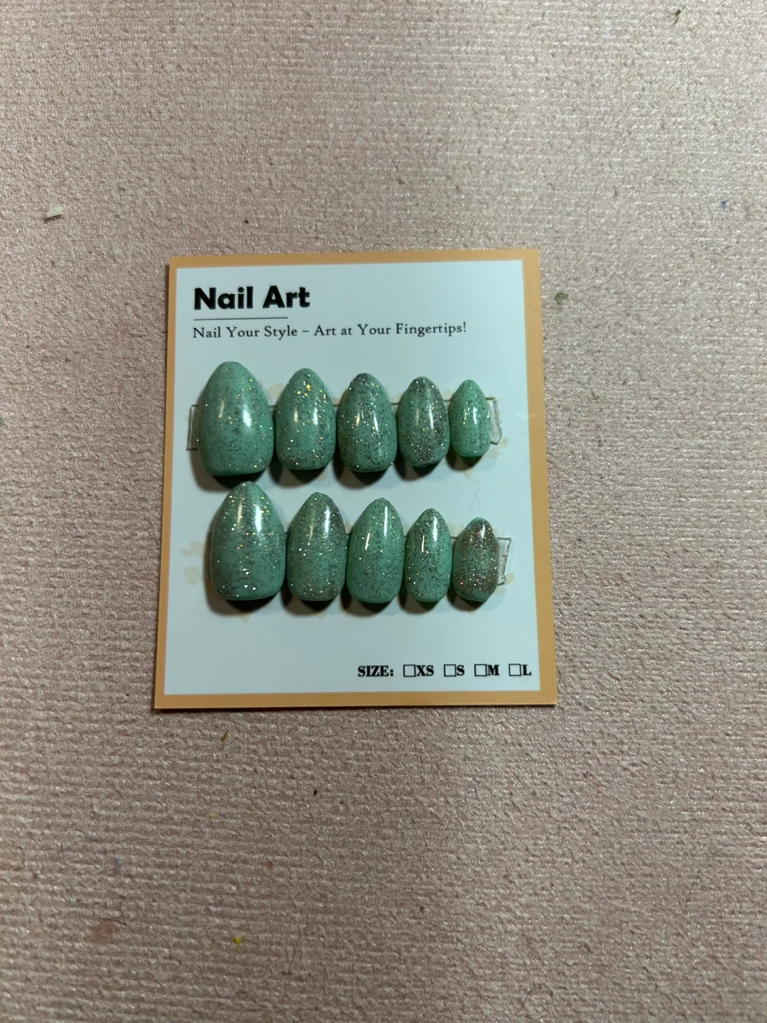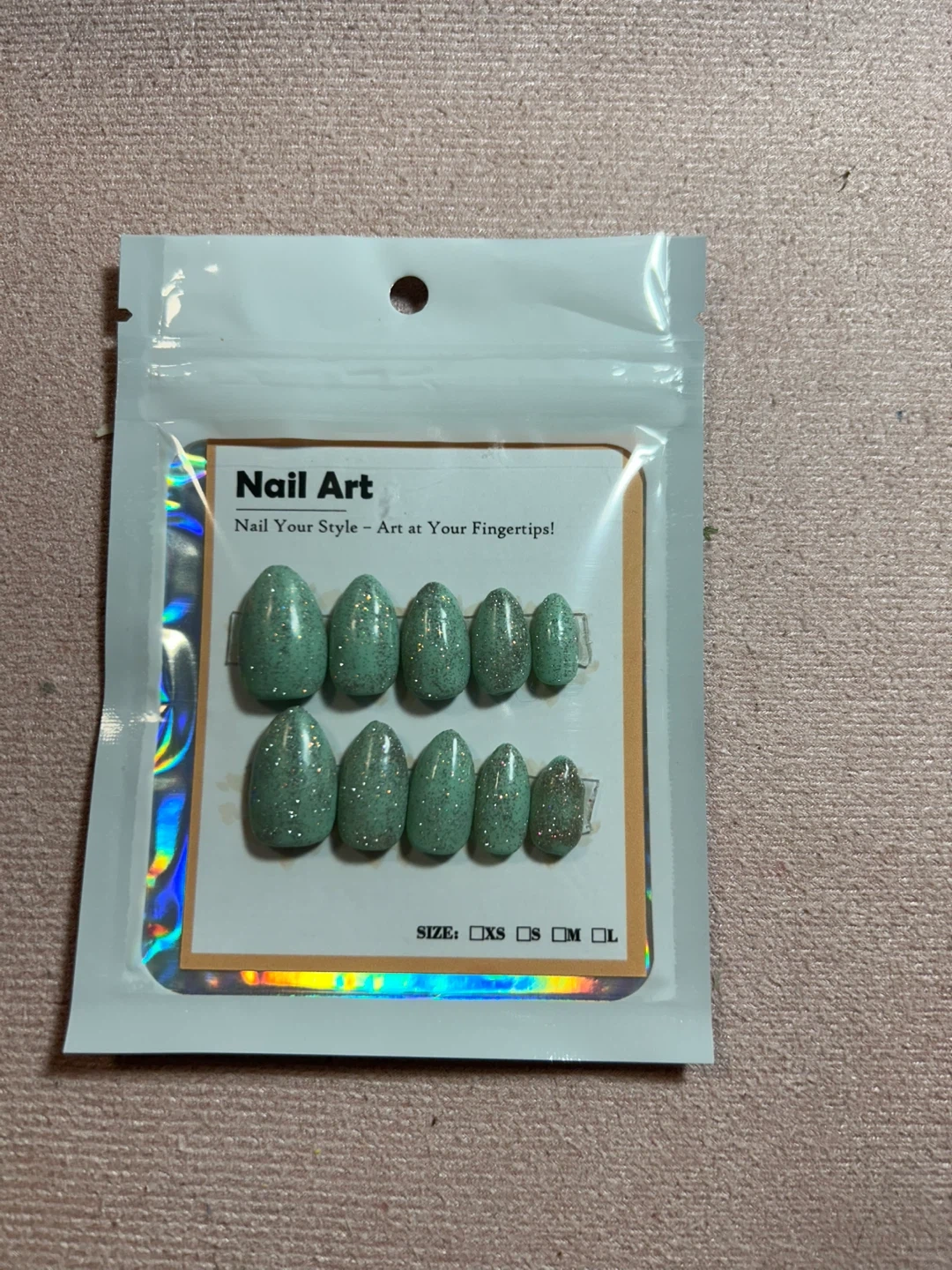 These mint green false nails have a subtle glitter finish. They're designed for easy application. Includes a set of 10 nails in various sizes and comes with everything you need!